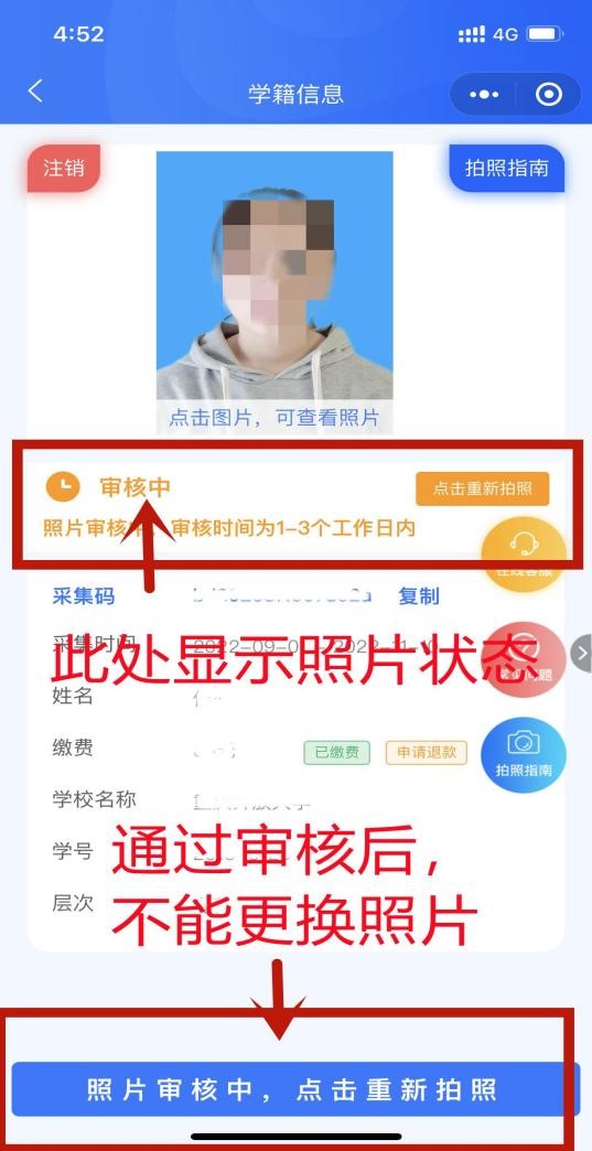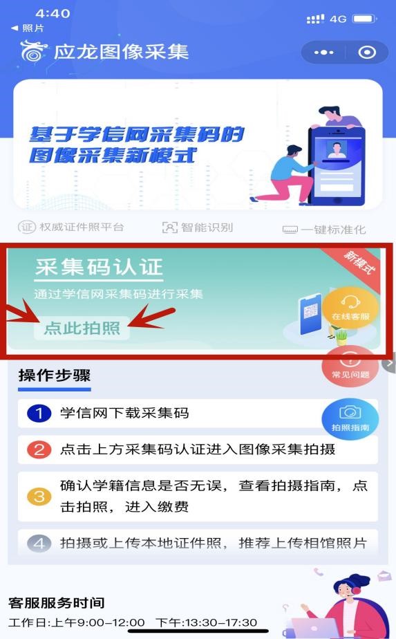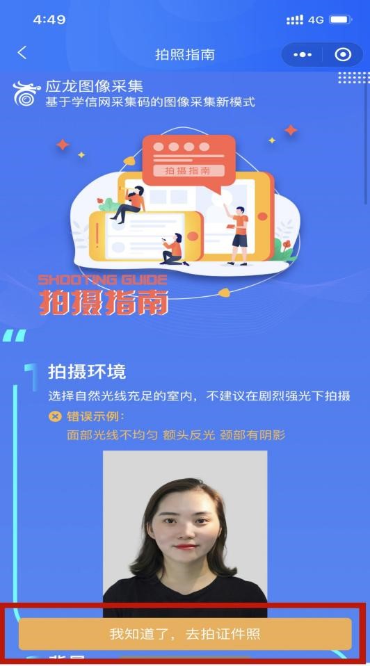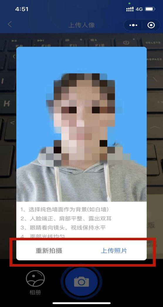 4. 缴费后,观看拍照指南,按小程序步骤,上传手机相册中已有的半身证件照或自助拍摄,完成采集。