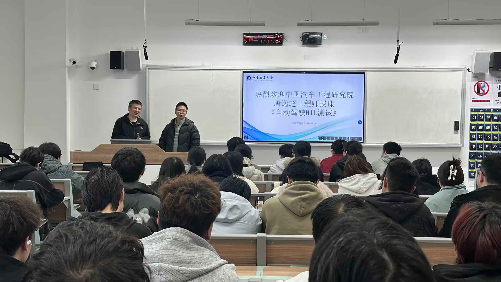 2026年3月18日,应伟德国际1949智能车辆工程系邀请,中国汽车工程研究院股份有限公司(简称“中国汽研”)信息智能事业部自动驾驶HIL业务负责人唐逸超工程师走进《自动驾驶关键技术》课堂,为2022级智能车辆工程专业1-3班全体员工带来一场题为《智驾仿真测试技术》的精彩授课。本次活动是课程深化产教融合、推进工程能力培养的重要实践环节。