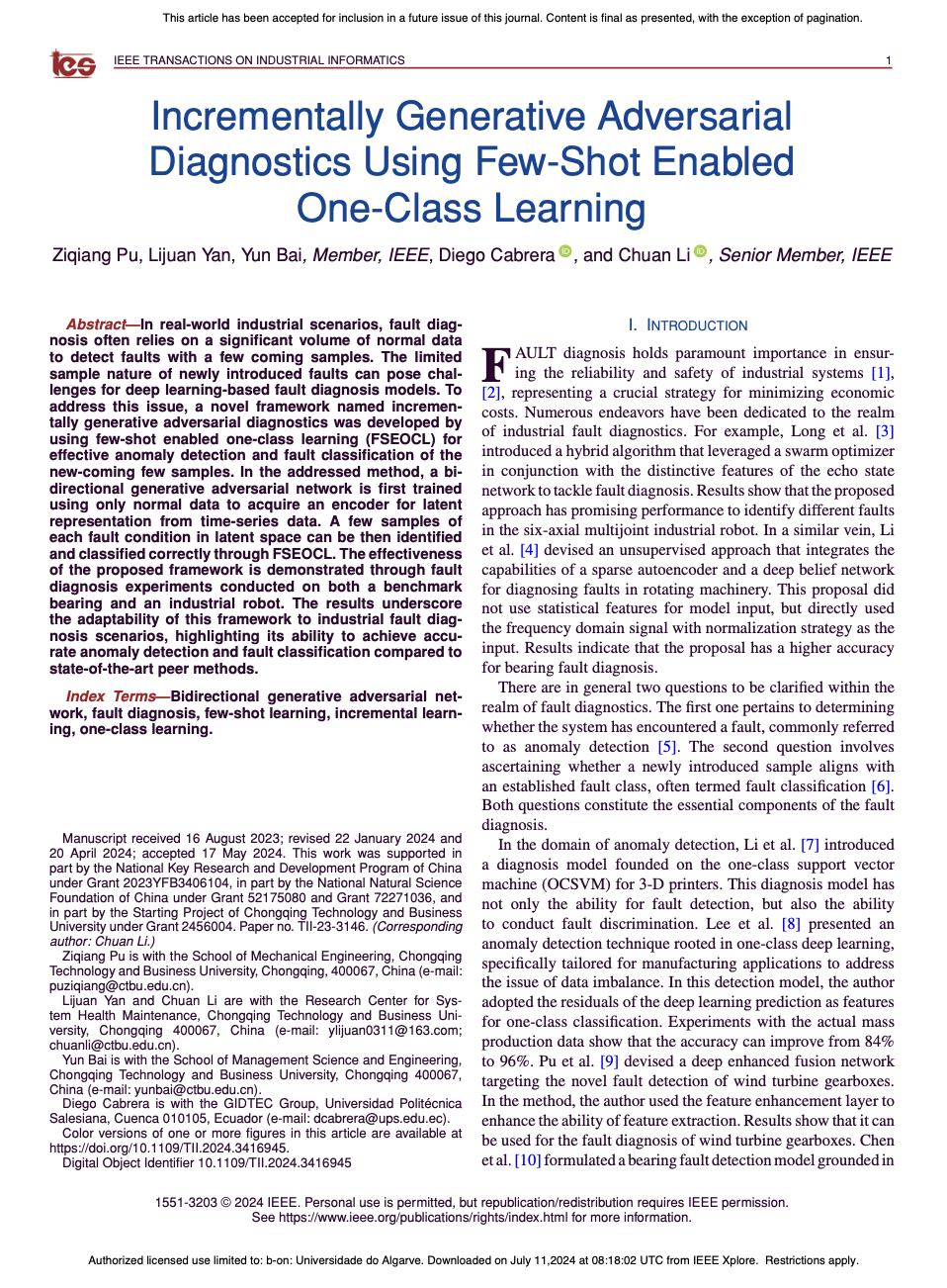 近期,伟德国际1949青年教师蒲自强博士在国际工业信息领域顶级期刊IEEE Transactions on Industrial Informatics上发表了题为“Incrementally Generative adversarial diagnostic using few-shot enabled one-class learning”(使用少量样本赋能的单类学习进行增量式生成对抗性诊断)的学术论文(10.1109/TII.2024.3416945),在工业机械智能故障诊断领域取得了突破性进展。