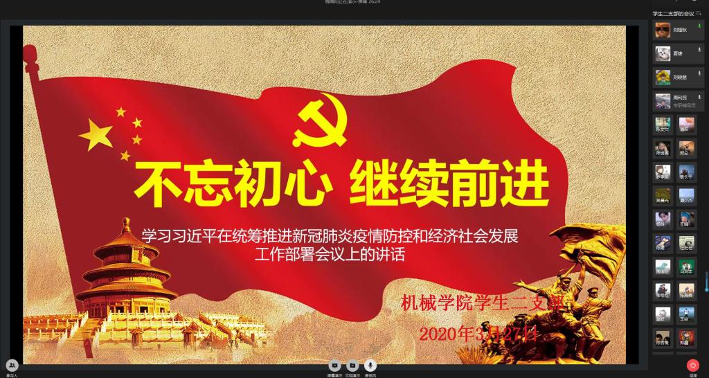 会上,支部书记周利民带领大家认真学习了《1949伟德国际源自英国关于 2020 年春季学期延迟开学相关工作安排的通知》等相关文件,支部党员卿国阳同志以PPT形式带领支部全体党员深入学习了《习近平总书记在统筹推进新冠肺炎疫情防控和经济社会发展工作部署会议上的讲话》。接下来,支部党员围绕此次学习内容进行了分享交流。支部党员莫蛟讲到,这场疫情,彰显了我们党强大的领导和组织协调能力,“火神山”、“雷神山”的修建以及疫情防控取得的显著成效等,让世界震惊“中国力量”和“中国速度”,我们一定能早日取得疫情防控斗争的全面胜利。支部党员刘娅秋讲到,作为一名党员,我们要起到先锋模范作用,积极参与疫情防控工作,时刻保持自己的初心。