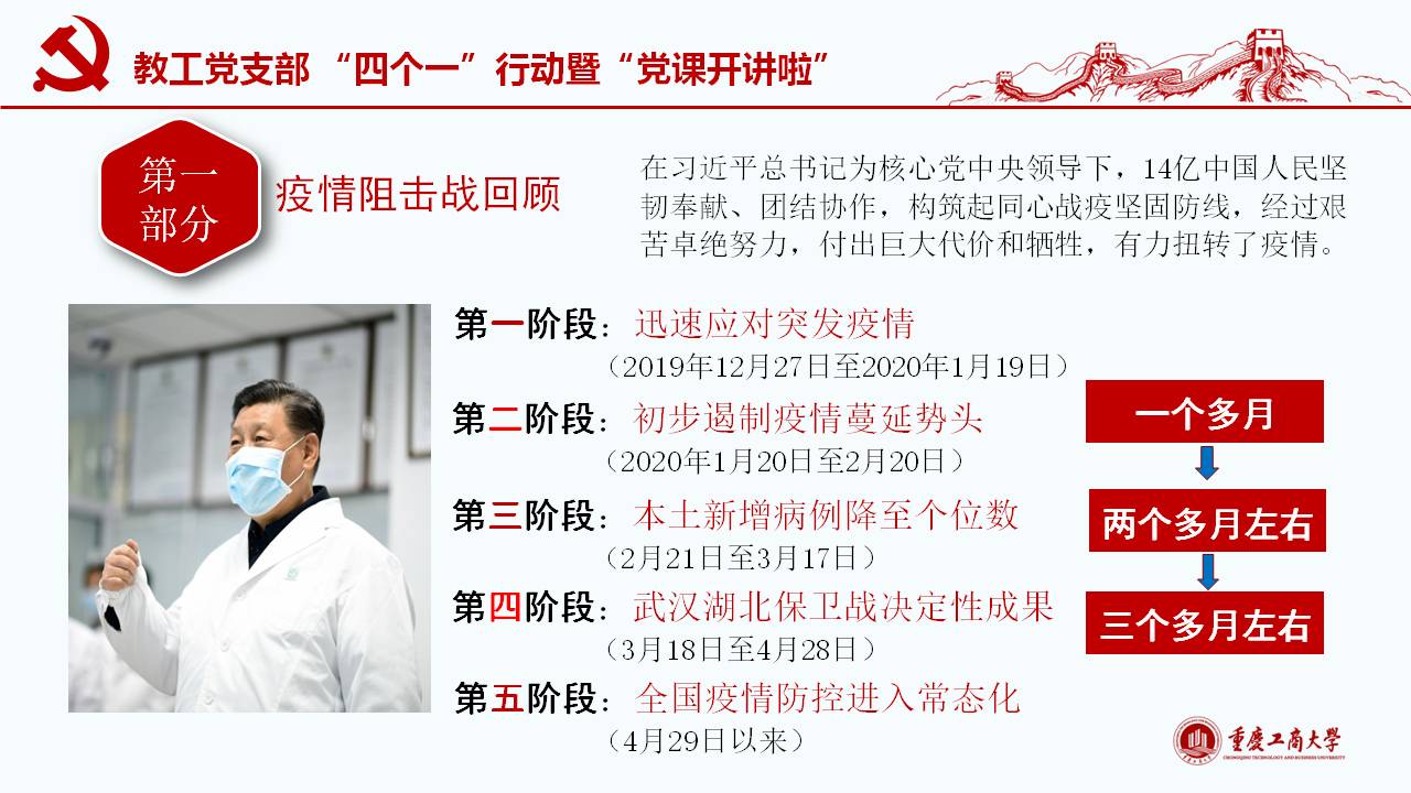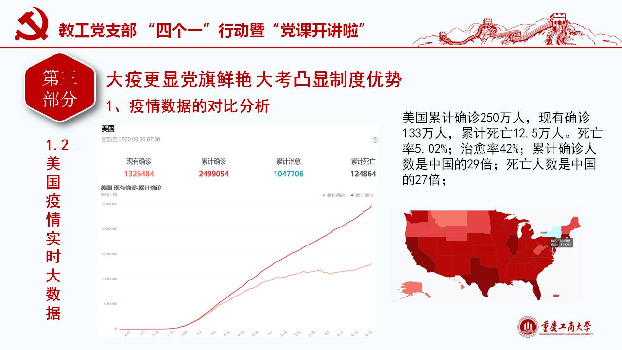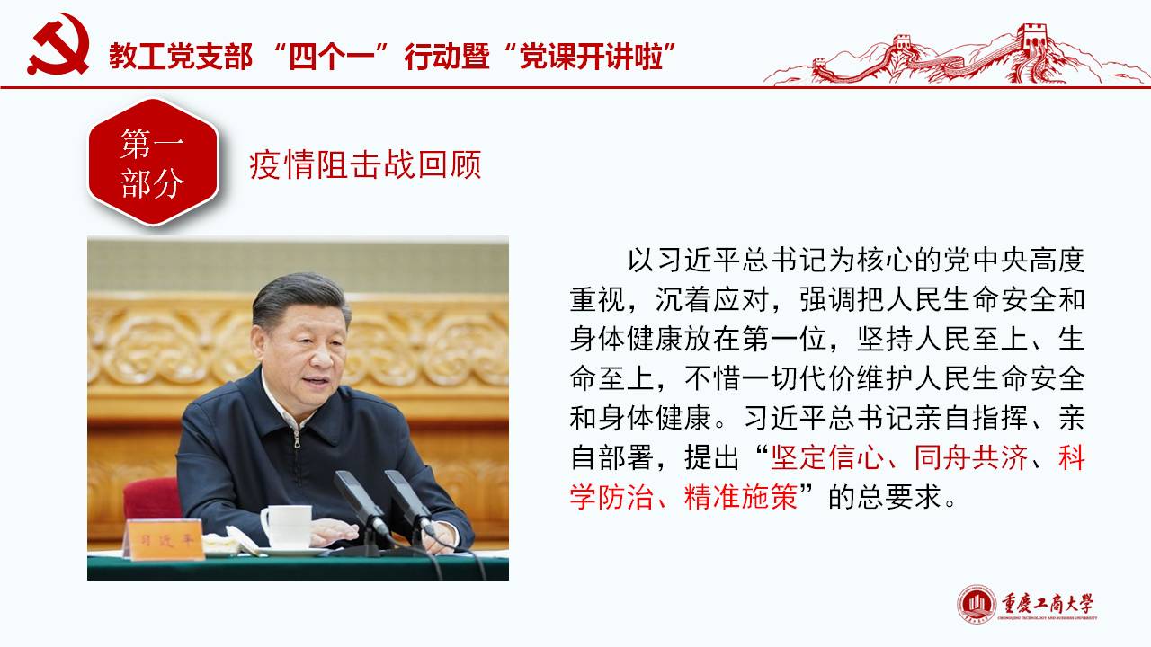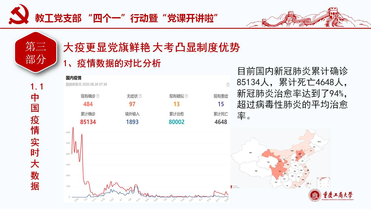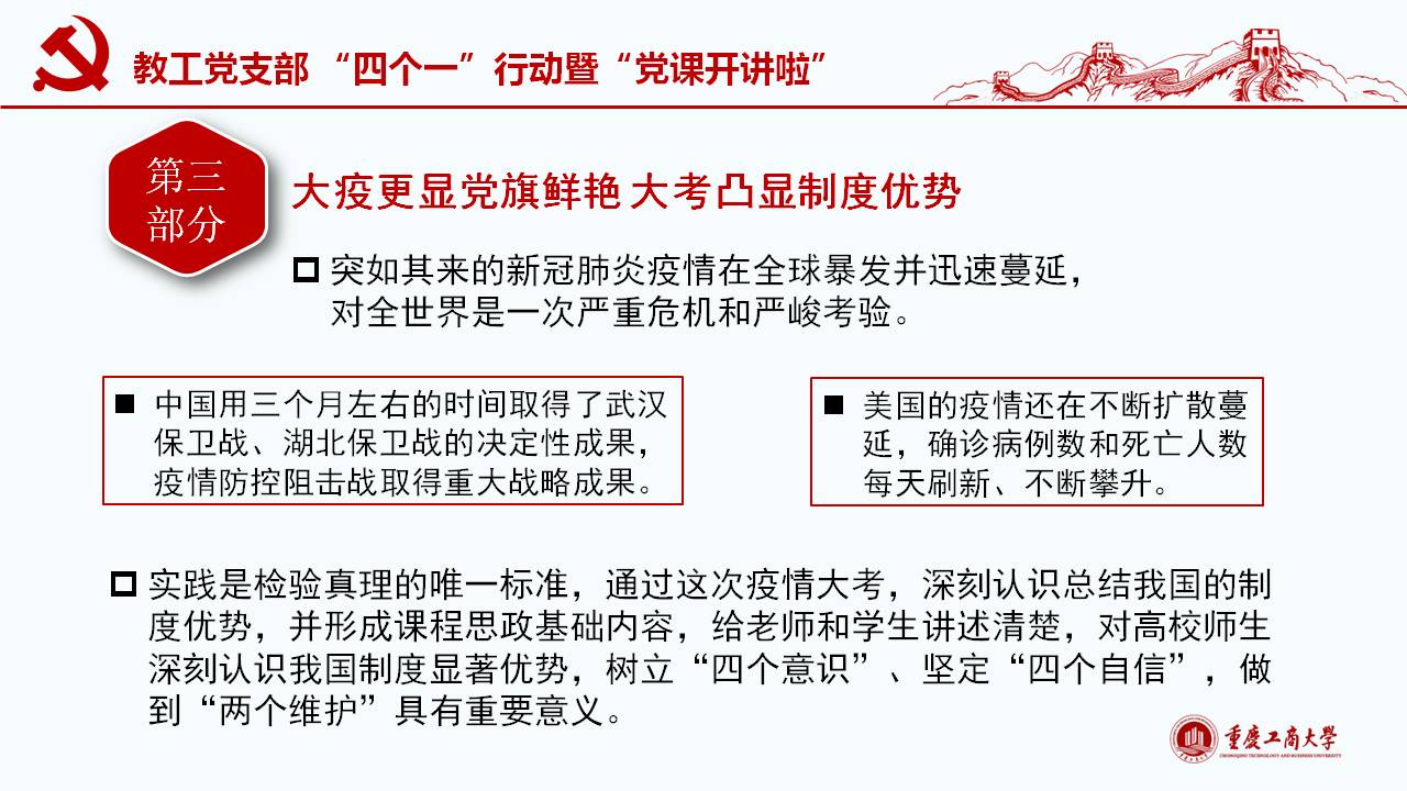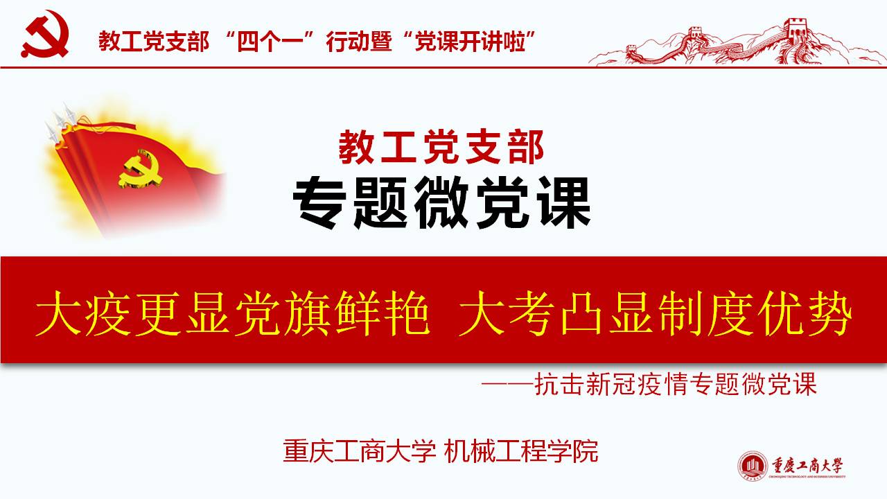 此次微党课紧密围绕习近平总书记“坚定信心,同舟共济,科学防治,精准施策”的疫情防控总要求,以及“把人民生命安全和身体健康放在第一位,坚持人民至上、生命至上,不惜一切代价维护人民生命安全和身体健康。”的重要讲话和指示精神,通过典型的事例和权威的数据对我国波澜壮阔的疫情阻击战进行回顾和解读;同时讲述了公司教工党员在员工返校复课期间的模范工作。通过将我国与西方代表国家最新疫情的权威数据对比,清楚展现我国疫情阻击战和防控战的显著成效,从而凸显党中央坚持全国一盘棋、集中统一领导疫情防控的制度优势。作为教工党员需要自觉增强“四个意识”、坚定“四个自信”、做到“两个维护”,在常态化疫情防控工作中起模范带头作用,立德树人,在课程思政环节分享抗疫思想体会。
