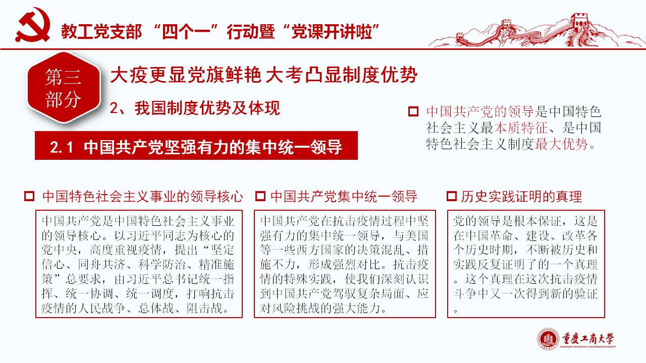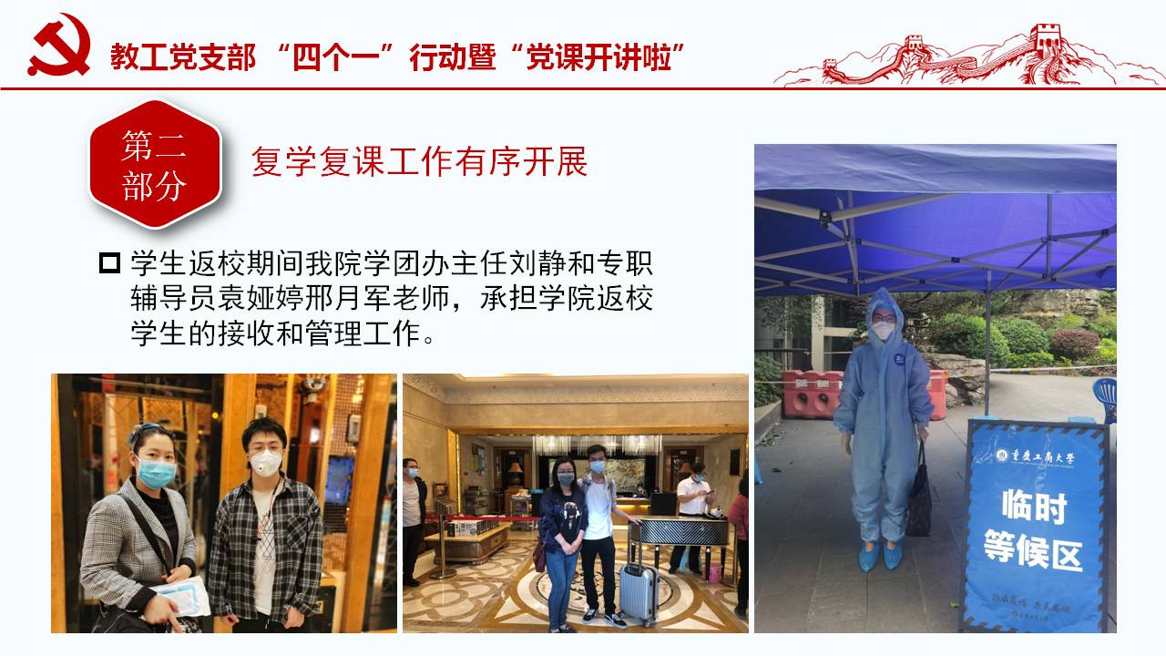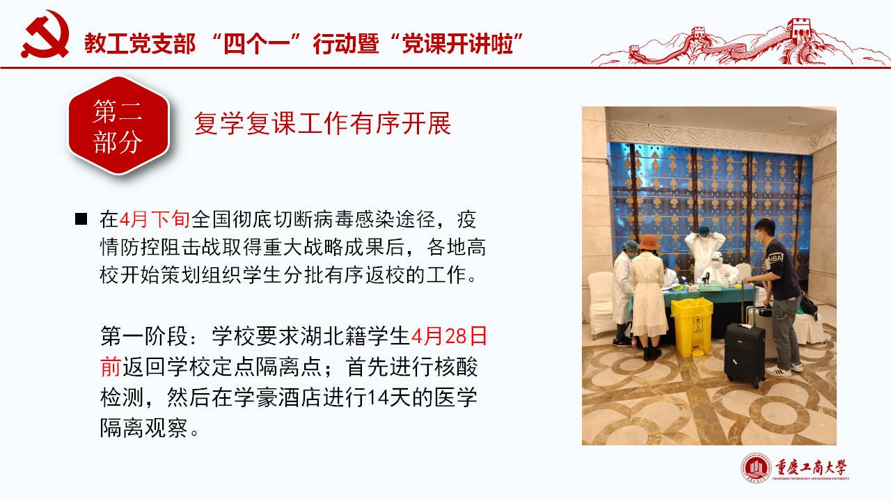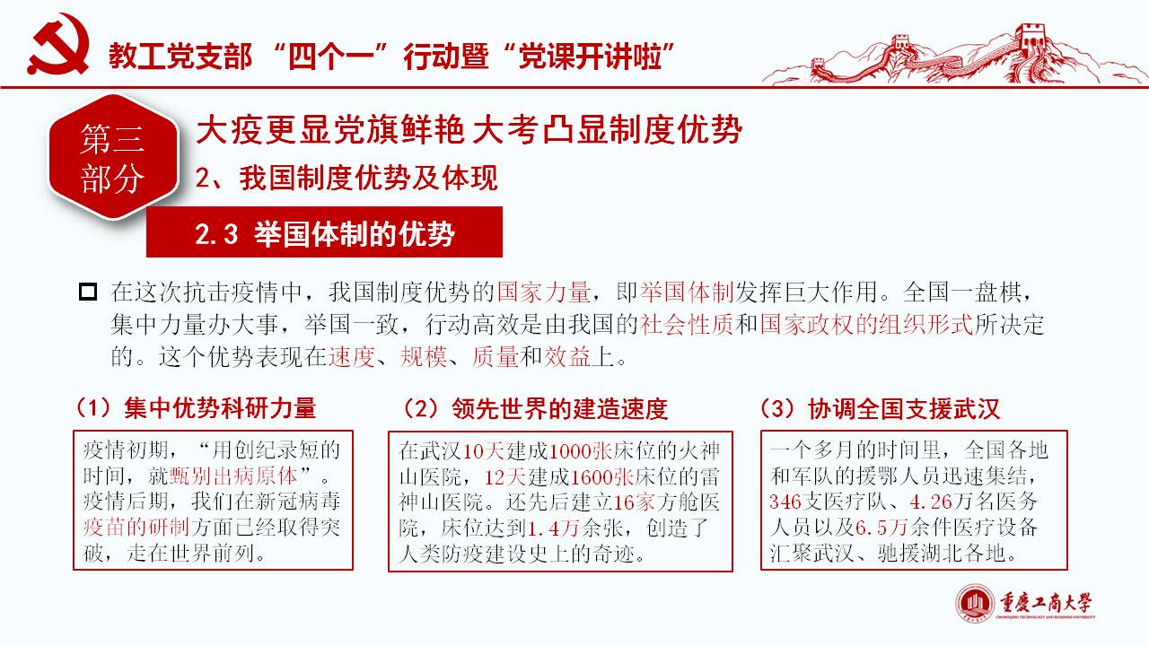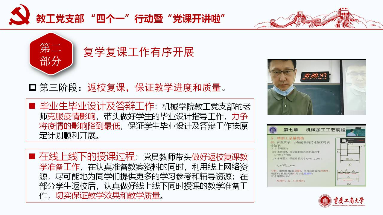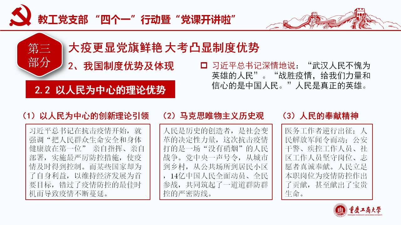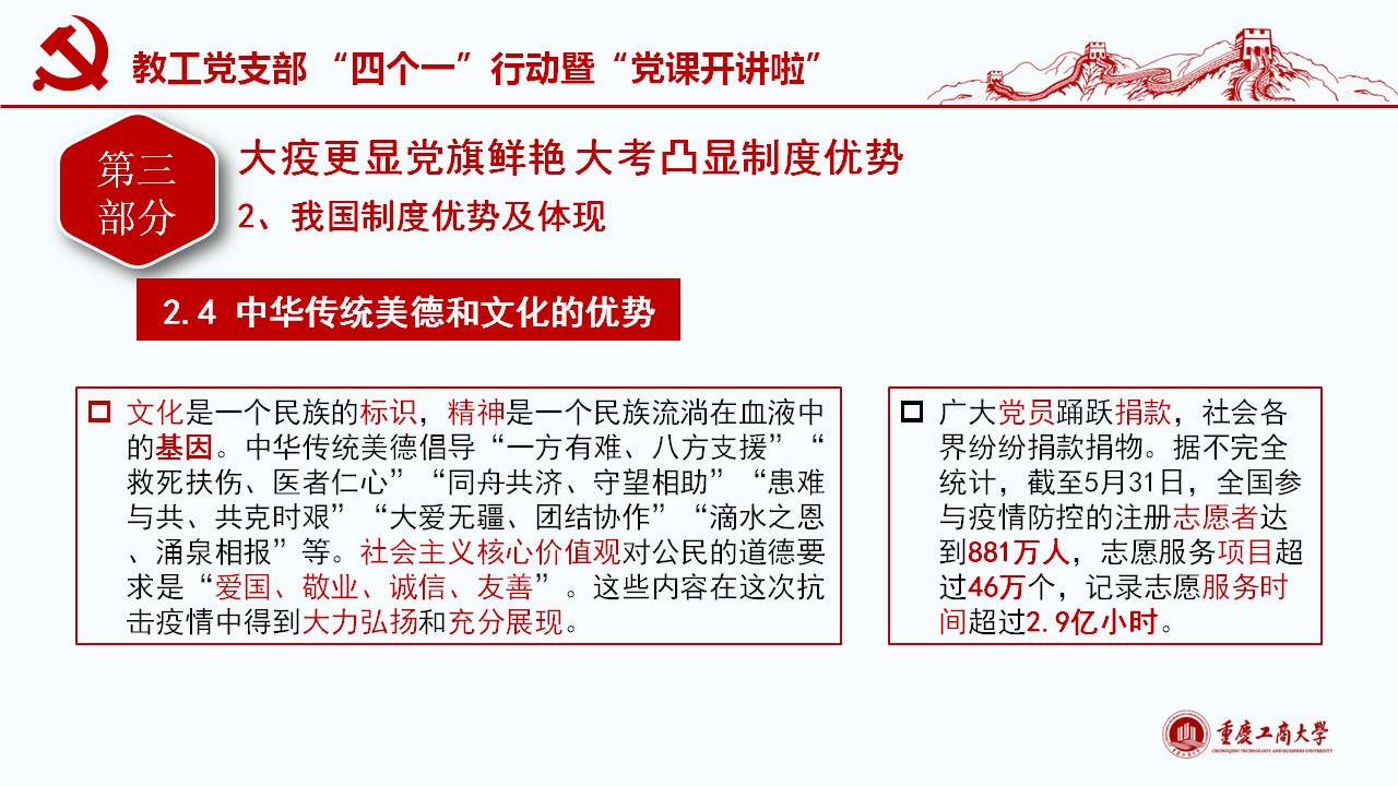此次微党课紧密围绕习近平总书记“坚定信心,同舟共济,科学防治,精准施策”的疫情防控总要求,以及“把人民生命安全和身体健康放在第一位,坚持人民至上、生命至上,不惜一切代价维护人民生命安全和身体健康。”的重要讲话和指示精神,通过典型的事例和权威的数据对我国波澜壮阔的疫情阻击战进行回顾和解读;同时讲述了公司教工党员在员工返校复课期间的模范工作。通过将我国与西方代表国家最新疫情的权威数据对比,清楚展现我国疫情阻击战和防控战的显著成效,从而凸显党中央坚持全国一盘棋、集中统一领导疫情防控的制度优势。作为教工党员需要自觉增强“四个意识”、坚定“四个自信”、做到“两个维护”,在常态化疫情防控工作中起模范带头作用,立德树人,在课程思政环节分享抗疫思想体会。