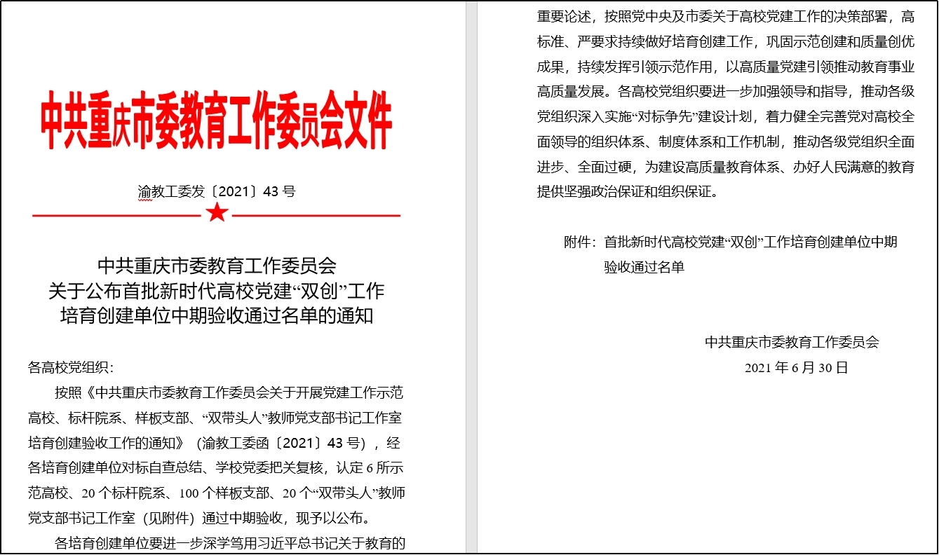 近日,重庆市教委发布了关于公布首批新时代高公司党建“双创”工作培育创建单位中期验收通过名单的通知,伟德国际1949教工第一党支部顺利通过全市首批样板支部培育单位中期验收。