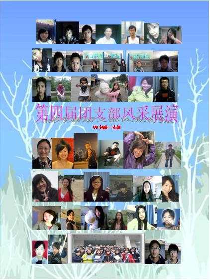 09包装一支部的全体团员们非常重视此次大赛。经过数天的精心准备和策划,制作了一刊内容丰富,装帧精美的参赛材料。材料中全支部成员的个性化相片作为参赛封面,将团建理念、团员情况、团组织生活开展情况和所获荣誉编辑成册,并绘制了一幅以莲花为底面的宣传海报张贴在兰花湖馨园食堂门前。参赛过程中同学们纷纷建言献策,材料准备独具特色,别有用心,很好的展示出了09包装一支部团结友爱,积极向上的班级精神。