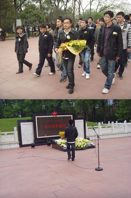 4月2日下午,趁着大家还没有回家,07机电二团支部组织支部全体成员去歌乐山烈士墓扫墓。尽管天气略显阴沉,却也和大家沉痛的心情相呼应。经过一个半小时的车程,大家来到了歌乐山烈士墓。顾不上旅途的劳累,一下车大家就来到烈士墓前为烈士们献花。大家迈着沉重的步伐走到烈士墓前,派代表向烈士们敬献鲜花,大家站在烈士墓前默哀三分钟――我们要告诉烈士们:他们的鲜血没有白流,他们的生命没有白白牺牲,正是有了他们的牺牲才换来了中国如今的繁荣与富强,而我们青年学子也不会坐享清福,我们会沿着先烈们的足迹继续为中国的社会主义现代化建设而奋斗,愿革命先烈们安息。而后同学们向烈士们三鞠躬,并绕行烈士墓一圈,摘下胸前的鲜花撒向烈士墓。