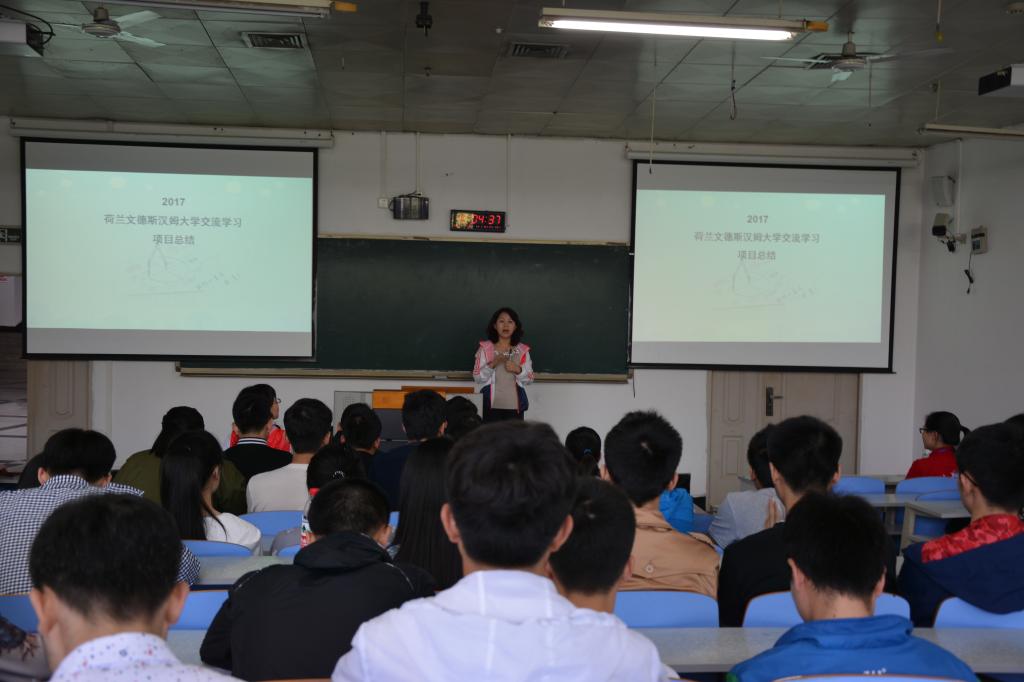 荷兰交流学习项目的带队老师之一李玲老师为同学们作了此次交流学习活动的总体汇报,就学习、工作、生活、见闻等各方面跟大家分享了在荷兰为期2周的生活和自己的感悟,并给下次交流项目提出了一些建议。