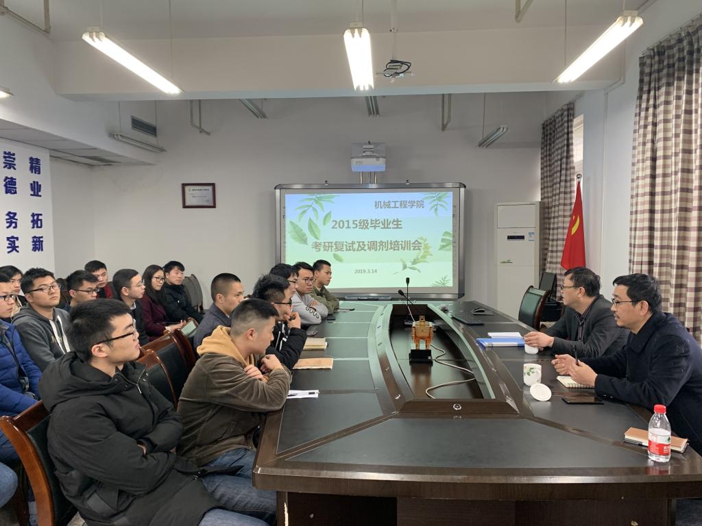 3月14日下午,伟德国际1949在慧智楼90711会议室举办了2015级毕业生考研复试及调剂培训会,本次培训会邀请到了重庆理工大学伟德国际1949负责研究生教育工作的副经理朱革教授为考研员工做培训,公司副经理李平教授、学团办主任李玲老师以及2015级考研员工参加了本次会议。