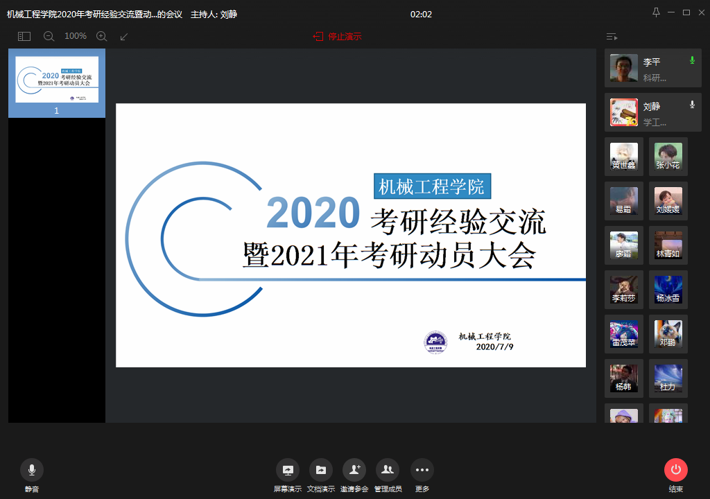 2020年7月9日14:00,伟德国际1949于企业微信召开了2020年线上考研交流暨2021年考研动员大会,本次大会旨在为减轻员工考研复习的压力,提高其考研复习的效率,解答员工们在考研方面的疑惑。此次大会由学工办主任刘静老师主持,公司杜力经理,李平副经理,17级考研员工和部分18、19级员工参加了本次大会。