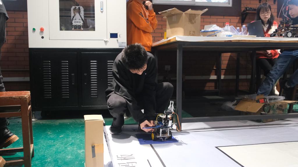 准备阶段,各个队伍都在不断调试着自己的小车,敲击着电脑上的键盘,显示屏上那一行行的代码不断变化着。他们在不断的讨论着,一遍又一遍的尝试着,为的就是能够在赛场上发挥出自己的最好水平。每位同学都在激烈讨论,如何提升自己小车的速度与稳定性。同时,位于场边的指导老师也对他们耐心教导,指出了每一组参赛队伍的问题,希望他们的成绩能够发挥得更好。