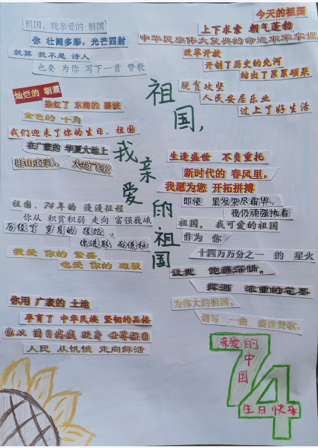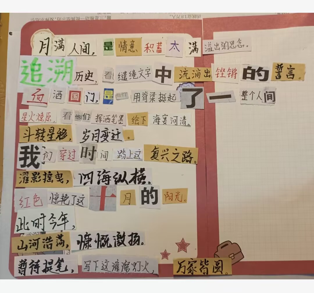 奋斗新天地,逐梦新时代。值此国庆来临之际,伟德国际1949特开展 “我以点滴颂衷情,我以我心向祖国”拼贴诗活动,鼓励同学发现藏在碎片中的诗意,大胆发挥自己的想象力和创造力,以诗歌来歌颂祖国的伟大新发展,表达自己的赤忱爱国心。以下展示部分优秀作品,献礼祖国母亲74周年华诞。