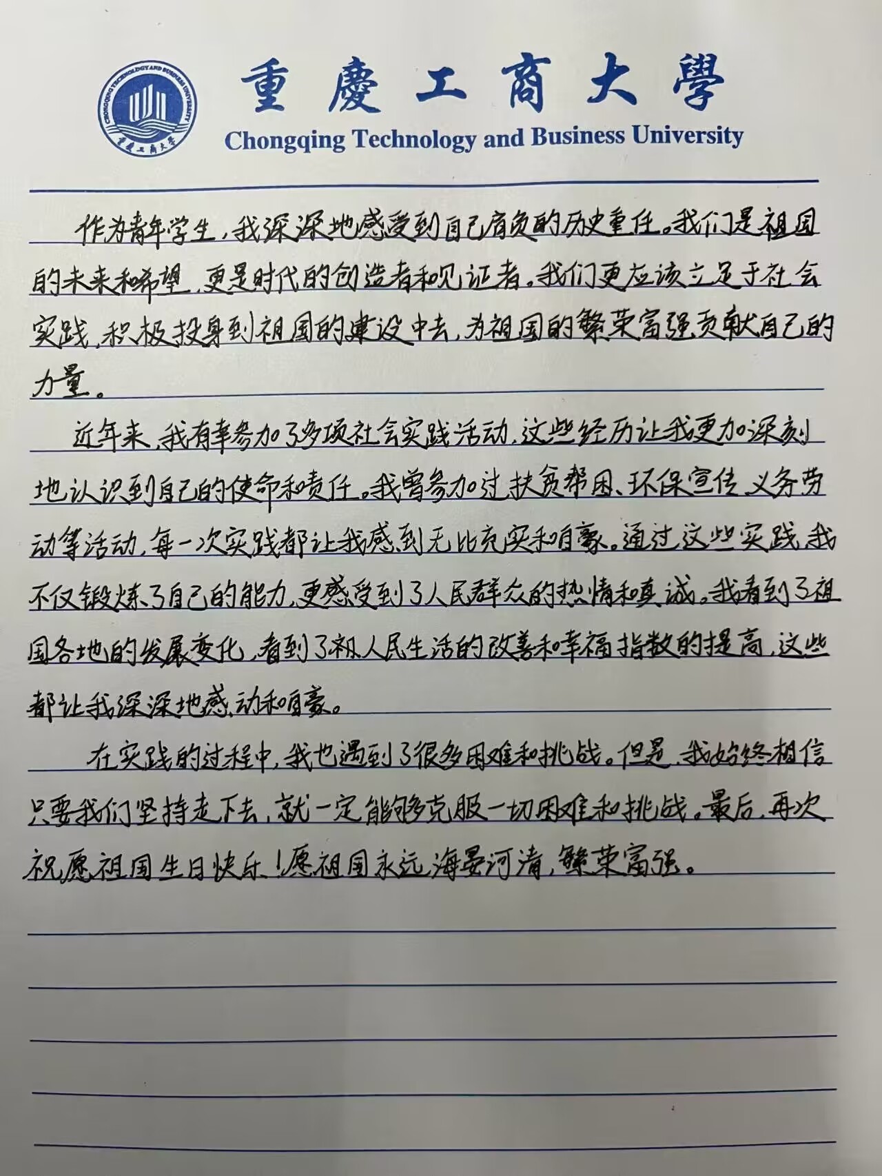 长风浩荡,时光飞逝,今天是祖国74周年诞辰。从大山走出,我见过乡间泥泞不堪的小路,也走过车水马龙的大街。党和国家给予了我站在这里的机会,也让我意识到,我的祖国依旧是五岳向上,一切江河滚滚东流,民族意识永远向前。而今,时代的考题已经列出,我们的答卷正在写就。唯有忆初心,方可筑始终。