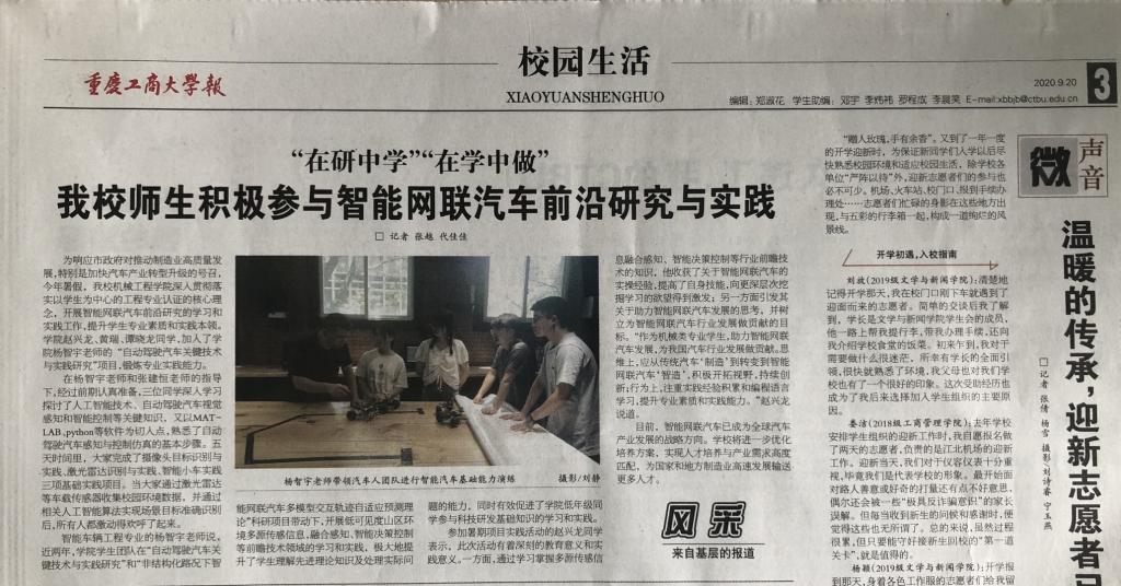 2020年暑期,公司社会实践团成员组队积极参与教师的前沿研究,引发媒体关注,继《重庆日报》全媒体平台报道后,近日,《1949伟德国际源自英国报》以《“在研中学”“在学中做”公司师生积极参与智能网联汽车前沿研究与实践》为题对此进行了深度报道。