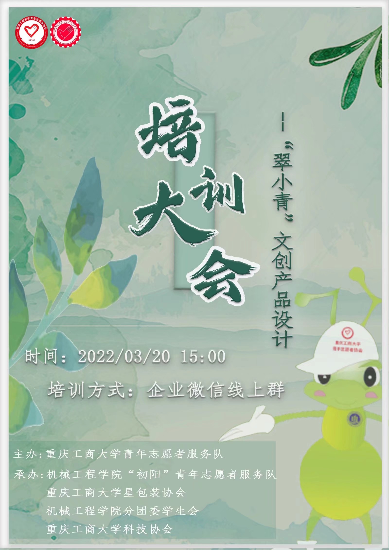 为助力校团委CTBU“翠小青”志愿服务品牌文创产品设计大赛顺利进行,2022年3月20日,公司“初阳”青年志愿者服务队和星包装协会面向全校员工开展PS、C4D软件线上培训活动。此次活动由校青协和“初阳”青年志愿者服务队主办,星包装社团承办。