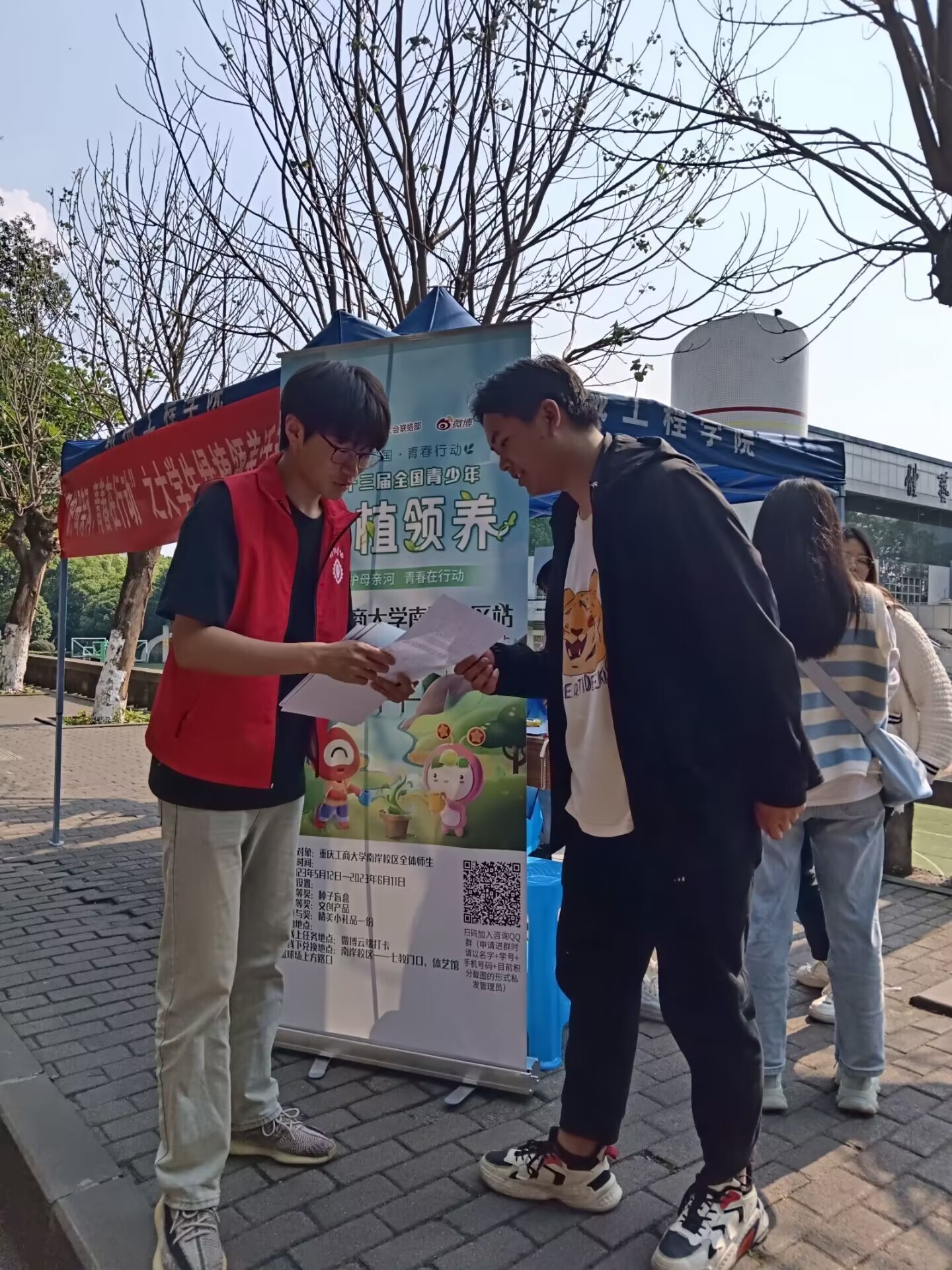 为响应国家保护母亲河的措施,号召更多人参与守护母亲河,2023年5月12日,伟德国际1949、经济公司在南岸校区南操体艺馆旁联合开展"绿植领养,保护母亲河,青春在号召"的主题宣传活动.