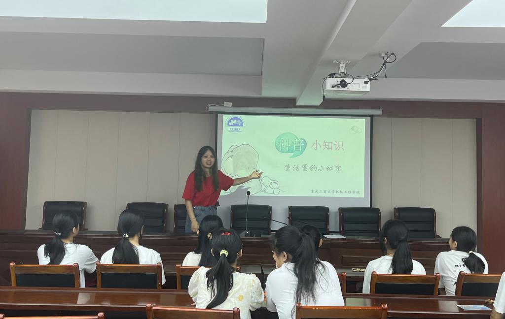 宣讲团成员唐铭族展开科技普及宣讲,带领社区青少年体悟科技科普实践,开启科技海洋遨游之旅。在第一个环节中,宣讲团以“PPT+视频”的形式,面向青少年科普科技小知识。宣讲内容丰富多样,广泛涉及汽车、航天、宇宙、星系等领域。随后,科普课堂步入第二环节,宣讲团成员通过科技趣味问答与同学们进行互动式科普,进一步激发他们对科技小知识的兴趣,感悟“科技服务凝力量”的深刻内涵,在科普中感受科技给我们生活带来的便利和乐趣。