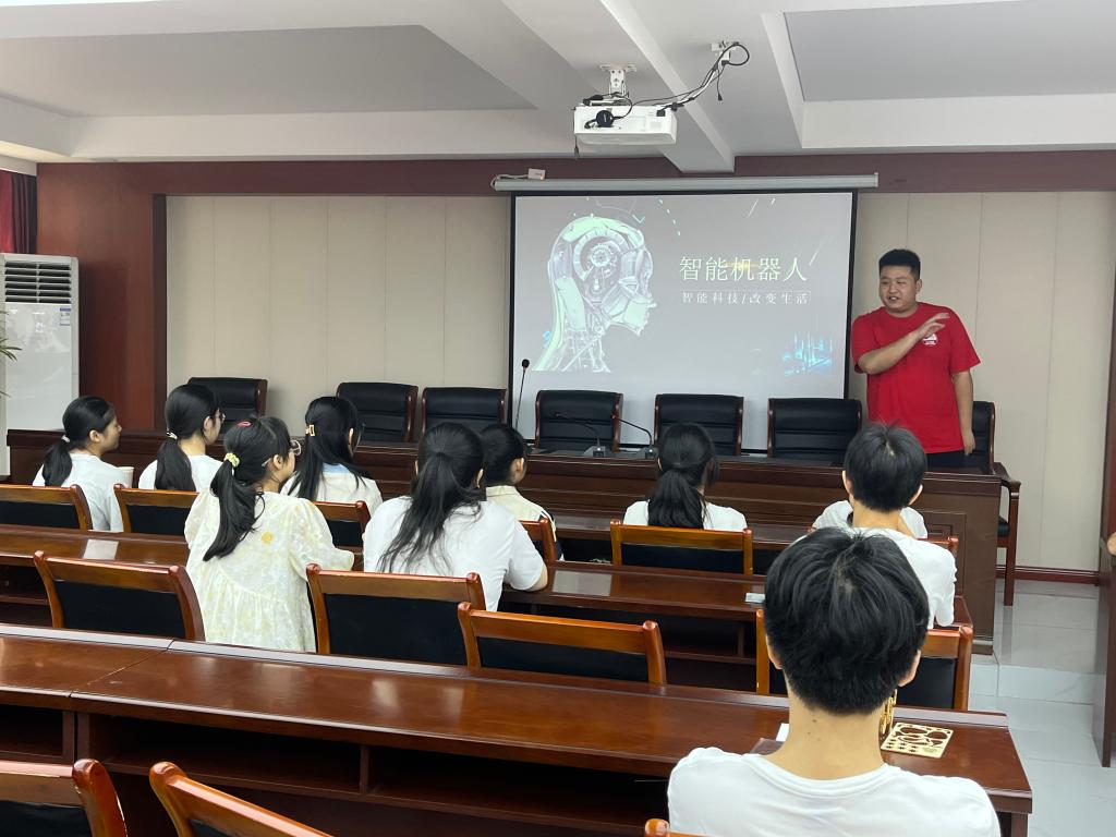 宣讲团成员黄丰以“智能科技,改善生活”为纲领,通过“图片+讲解”的方式,对比电影里的机器人和生活中的机器人,引出本节科普课程的重点讲解对象——NAO机器人。在课堂上,黄丰生动形象地介绍了NAO机器人的主要功能,它可以实现看、听、说、唱歌、跳舞、踢足球等人机交互功能,智能程度遥遥领先。随后,黄丰展示NAO机器人实现人机交互功能的程序界面,对应程序讲解每个子块控制的领域和功能。课程内容吸引着青少年的目光,他们目不转睛地盯着屏幕,惊讶与好奇在脸上洋溢,展现出浓厚的兴趣。
