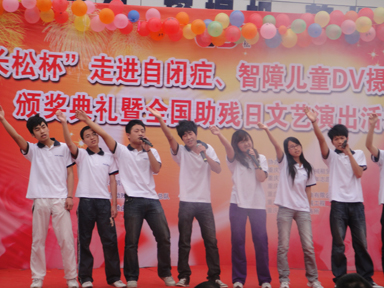 将爱传播,不求回报,只愿所有的自闭、智障儿童能够快乐健康成长,只愿再多一份爱的阳光铺撒在这些特殊的儿童身上。携带着这份信念、这份责任,伟德国际194960余名优秀志愿者及09级辅导员张春媚老师一大早8点钟便来到了乐一融合幼儿园,和这些智障小朋友们一同参加了“长松杯”走进自闭症、智障儿童DV摄影大赛颁奖典礼暨全国助残日文艺演出活动。