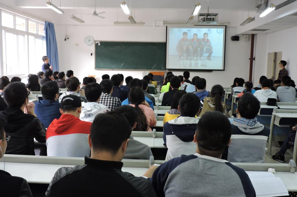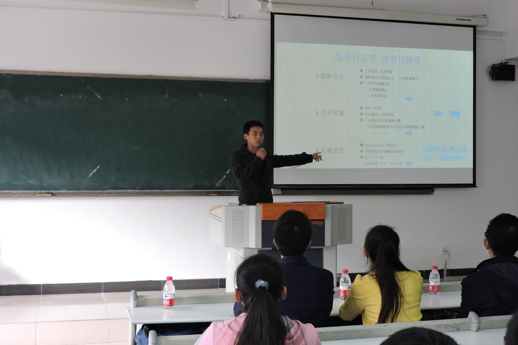 赛前指导交流会特地邀请了夏贞波和彭良怀两位优秀学长来对参赛人员进行指导。首先,科技协会会长王剑宇播放他的团队去年历时九个月的小车创作过程,给我们分享他历时九个月的赛事状况,从起初一个个小零件到最后组合而成的小车,离不开团队的辛勤努力和老师的默默陪伴与帮助。接着12级学长夏贞波分享他比赛过程中各种经历与感受,为我们讲解了关于创新设计、学科竞赛、兴趣爱好三个方面的要点,他表明设计不一定要高大上,可是一定要接地气。他还分享了他在历年比赛的经历与感悟,列举了一系列要用到的技能,让同学们受益匪浅。最后12级学长彭怀良讲解各项赛事注意事项及他自己独特的想法,使同学们更深入的了解比赛。