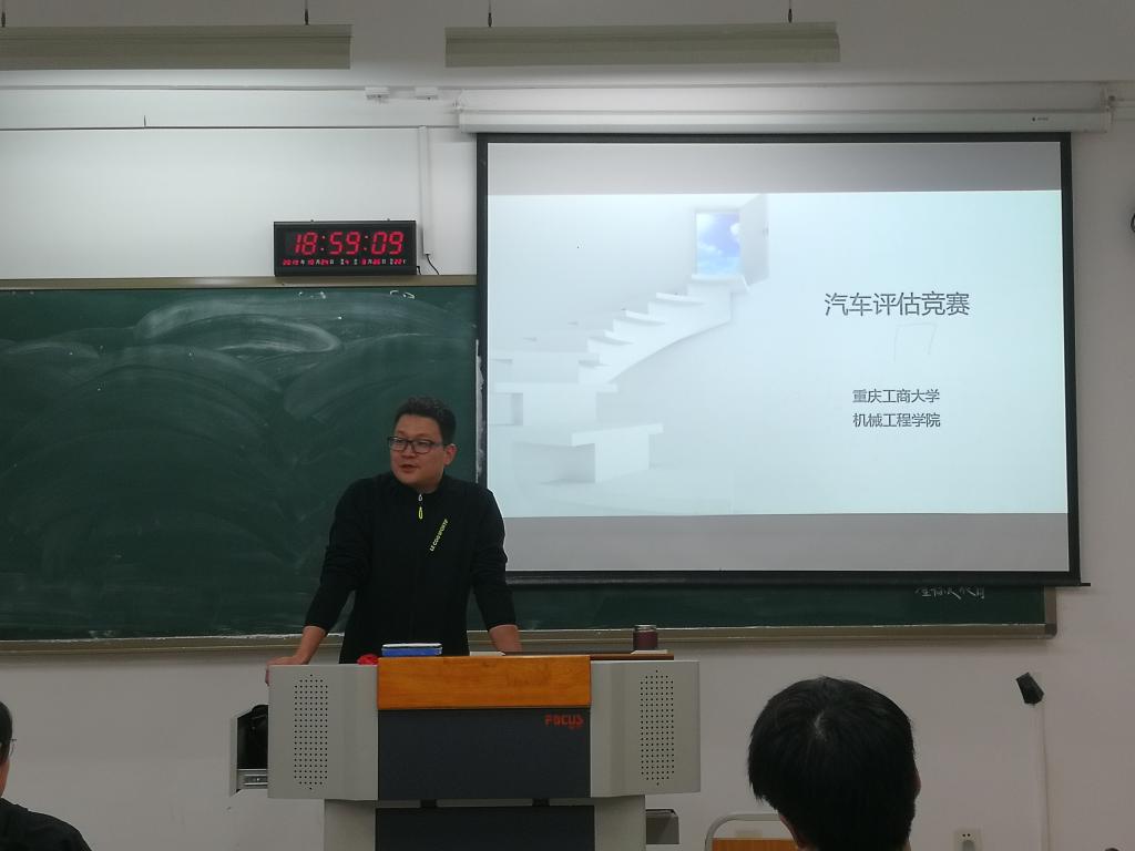 19点整,宣讲会正式开始。王老师讲到,参加这项比赛一定要对车的品牌、基本信息等有充分的了解,这是选手应具备的基本常识。之后,王老师又讲解了汽车评估师大赛的宗旨,并详细说明了竞赛主题、比赛形式、评定方式和大赛赛况。最后对此次主题进行了一些列举。