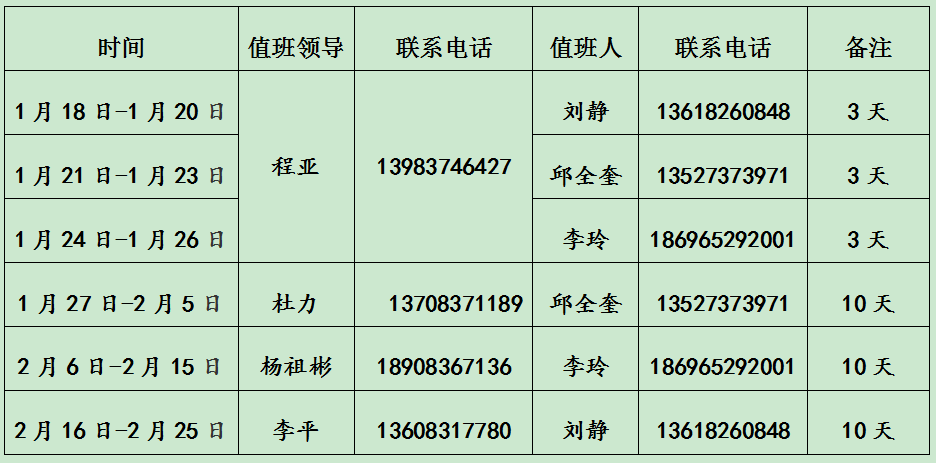 2020-2021学年第一学期寒假值班安排