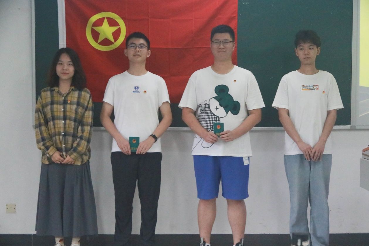 面对鲜艳的团旗,全体人员肃立,共同唱响国歌,激昂的旋律在教室里回荡,每一个音符都充满了对祖国的热爱与对团组织的敬仰。随后,新团员们迎来了他们人生中重要的时刻——佩戴团徽、颁发团员证。这一刻,小小的团徽与团员证不仅见证了他们辛勤付出的汗水和努力,更承载了作为一名共青团员所担负的神圣使命和责任。