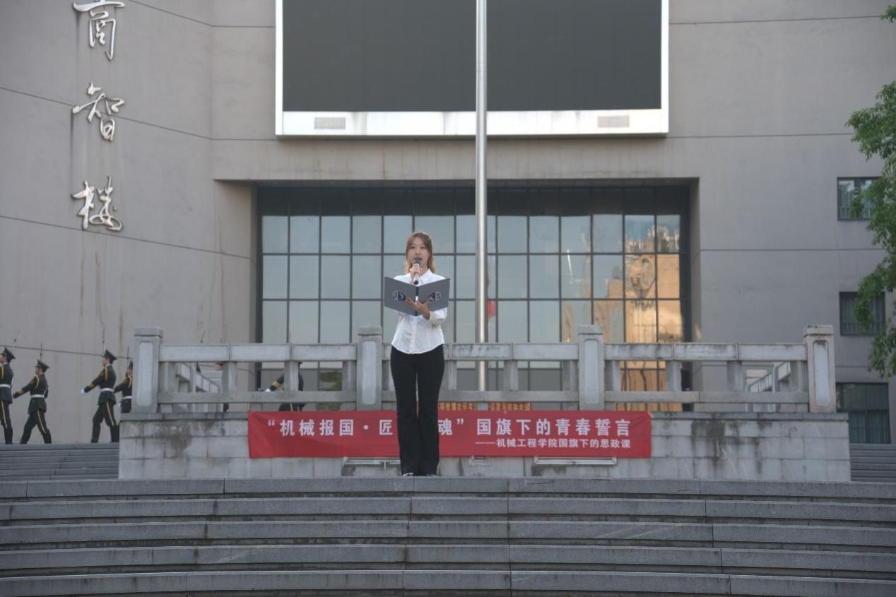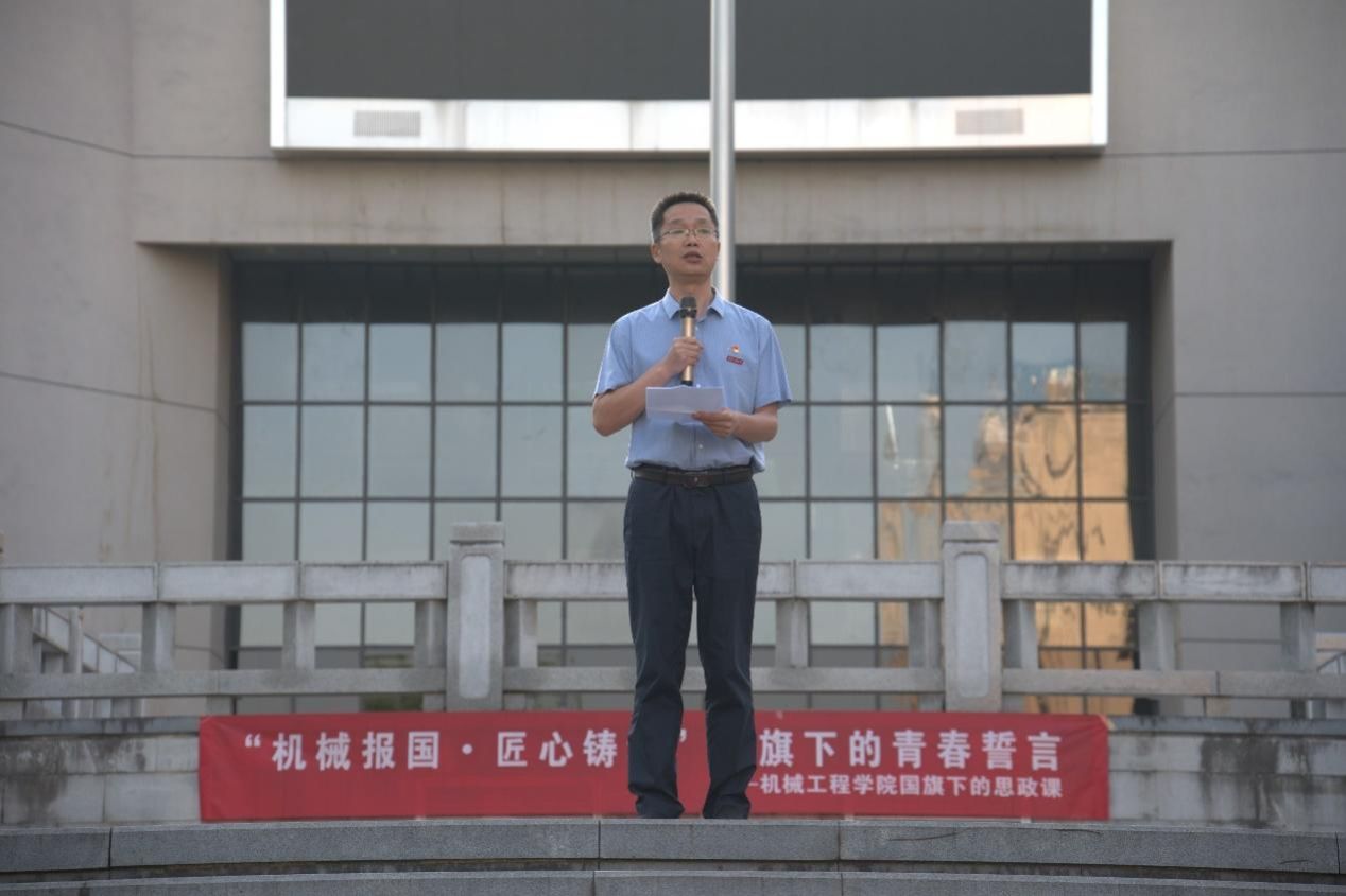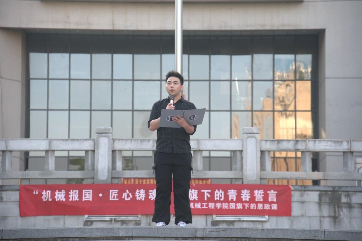 活动在庄严的升旗仪式中拉开序幕。国旗护卫队入场,全体师生肃立注目,伴随着雄壮的国歌声,五星红旗冉冉升起。员工代表胡富杰发表国旗下演讲。他从青年学子视角阐述了对“机械报国,匠心铸魂”的理解,表达了新时代老员工服务国家发展的决心和热情。