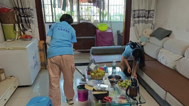 上午8点整,同学们带着工具和提前购买的防滑垫、收纳盒来到老人家中。5 名同学分成两组:一组负责 “器物养护”,另一组负责 “空间整理”。