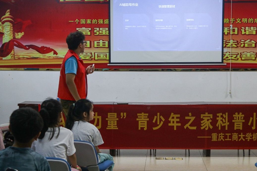 课堂以“小朋友们,你们知道什么是 AI 吗?”的提问开篇,面对这个略显陌生的词汇,多数小朋友或是歪着脑袋露出困惑的神情,或是轻轻摇头表示并不了解。实践团成员见状,便从孩子们熟悉的生活场景切入,结合手机语音助手、动画片里的智能角色等实例,用通俗易懂的语言解析 AI 概念,随后通过生动有趣的短视频展示 AI 在导航、修图、外卖推荐等场景的应用,让孩子们从无到有,直观感受科技对生活的渗透。