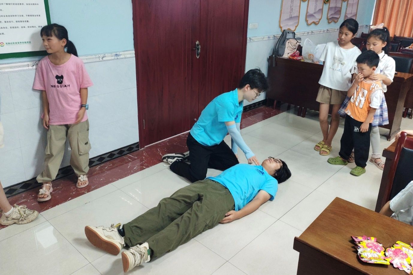实践团两名成员分别扮演救援者与溺水者,通过情景模拟生动还原防溺水救援全过程。从发现遇险人员、团队协作实施救援,到判断生命体征、规范开展心肺复苏急救,再到等待专业医疗救援,每个环节都细致入微。在沉浸式体验中,孩子们不仅系统学习了防溺水安全知识与应急救援要点,更切实增强了自我保护意识,深刻理解了生命安全的重要意义。