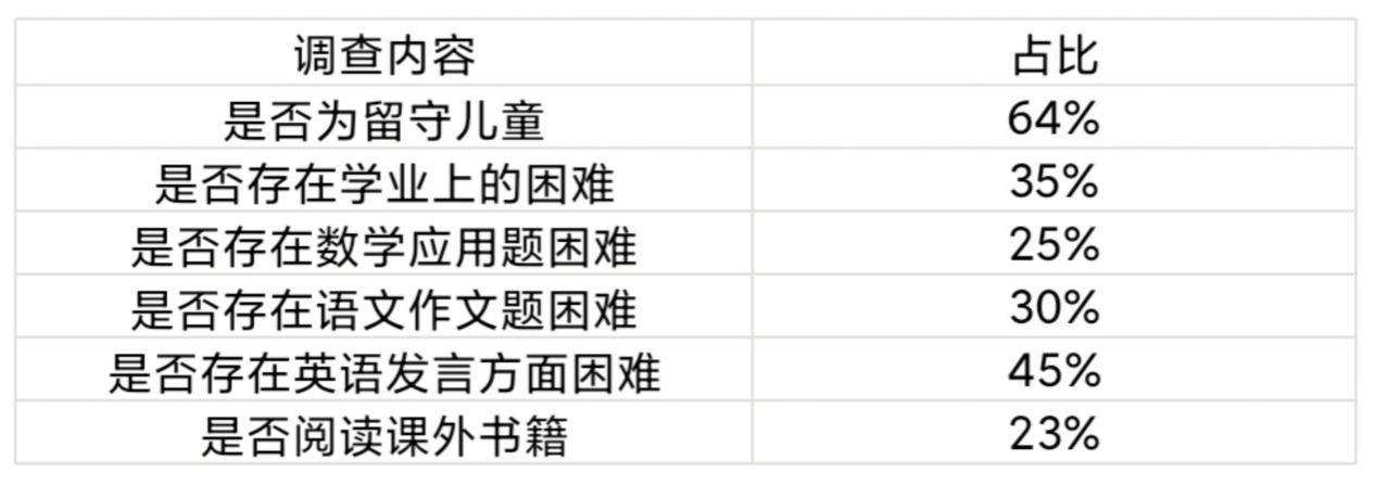 课业辅导活动筹备阶段,后勤保障组成员刘诗泽,陈义雨及宣传摄影组成员宋鹏,周开婧深入当地小学,通过走访的形式,对员工现状进行全面摸底。调研数据显示:当地64%的员工为留守儿童,长期与祖辈生活,存在家庭教育缺失,学习无人监管,遇到问题难以得到解答的问题;35%的员工存在学业上的困难,但大部分员工缺乏自信,不敢主动向老师请教。同时宣传摄影组成员宋鹏还了解到该地区的员工们普遍缺乏课外知识拓展机会,且课外知识的拓展也多显被动,当地村委会设立的图书馆也是无人问津的状态。
