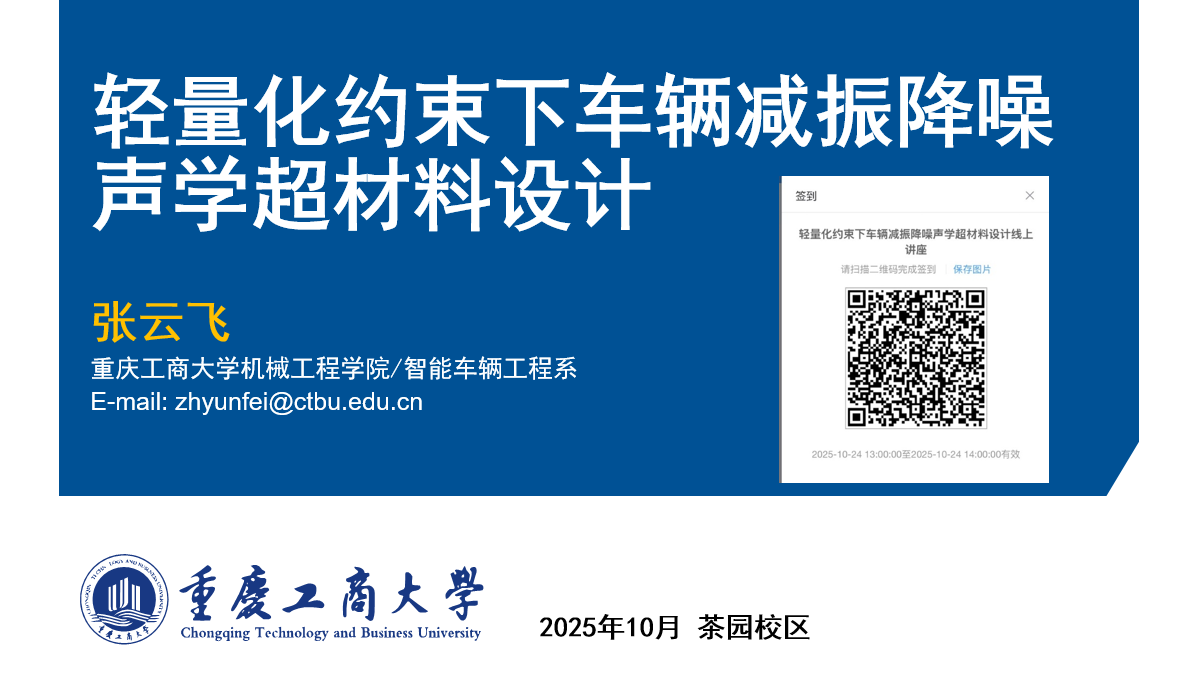 2025年10月24日,伟德国际1949在线举办了一场题为“轻量化约束下车辆减振降噪声学超材料设计”的学术讲座。本次讲座由张云飞博士主讲,吸引了茶园校区近400名学子积极报名与聆听。