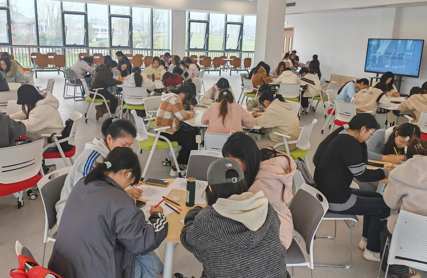 在轻柔的音乐声中,绘画体验环节正式开始。同学们沉浸在色彩与线条的世界中,自由选择色调,为曼陀罗图案赋予个人情感与内心投射。有的色彩热烈奔放,有的柔和宁静,每一幅作品都是心灵的一次悄然诉说。创作结束后,多位同学主动分享自己的绘画体验与内心感悟。一位同学表示,在涂色过程中她感受到前所未有的平静,“像是把内心的混乱一点点梳理整齐,画完之后整个人都轻松了。”另一位同学则分享道:“我选择了明亮的黄色和橙色,希望自己能像这些颜色一样,勇敢地发光。这幅画让我更加接纳当下的自己。”真诚的分享引发了现场同学的强烈共鸣。