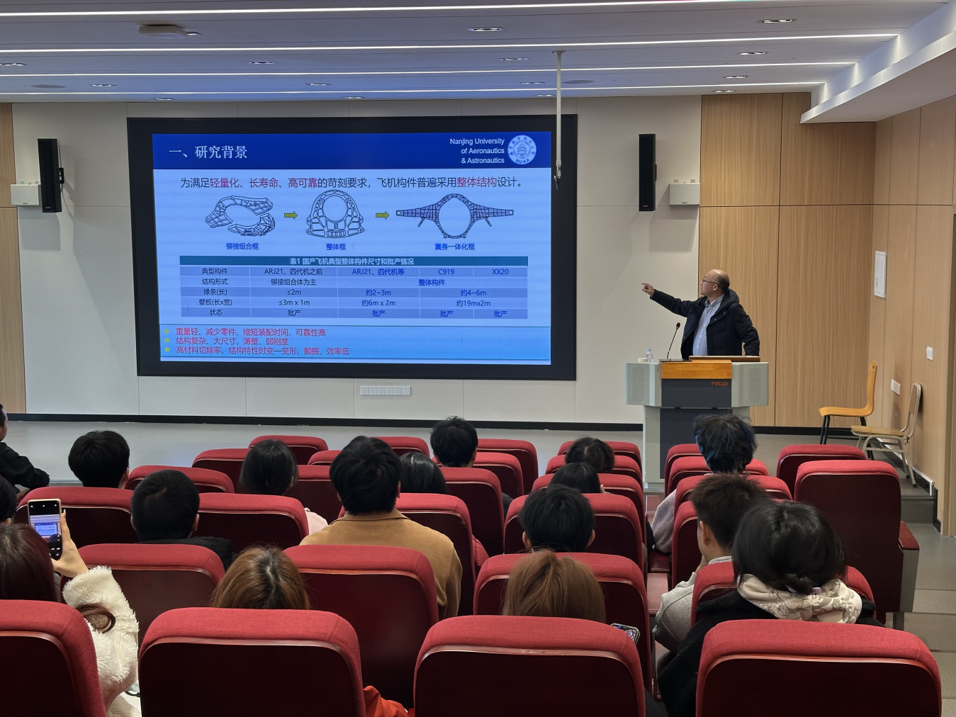 讲座中,杨教授首先点明整体薄壁件在飞行器轻量化、长寿命、低排放发展中的核心硬件地位,同时直指大型薄壁构件弱刚性特性带来的行业痛点:工序间加工变形波动剧烈、批次间轮廓度差异显著,这已成为我国多型号飞行器研制与批产中亟待破解的加工精度难题。
