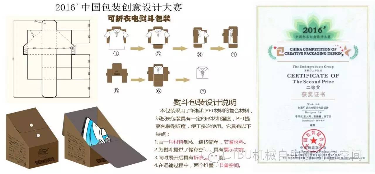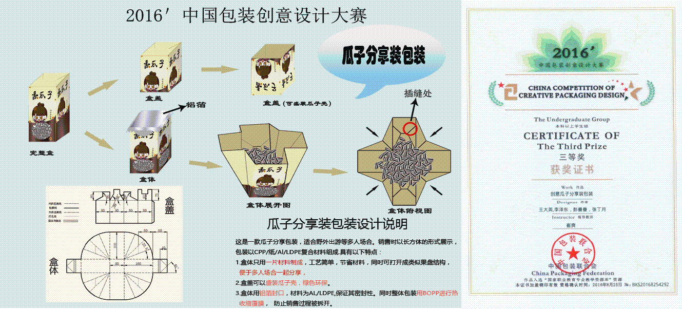 李泽东团队在导师崔爽的指导下,通过团队成员李泽东、王大英、彭曼曼、马丽艳的共同努力,开展了头脑风暴,观察日常生活中电熨斗的使用情况,历时五个月完成了“可折衣电熨斗包装”,获得全国包装创新设计大赛二等奖。创新设计的“瓜子分享装包装”荣获三等奖。