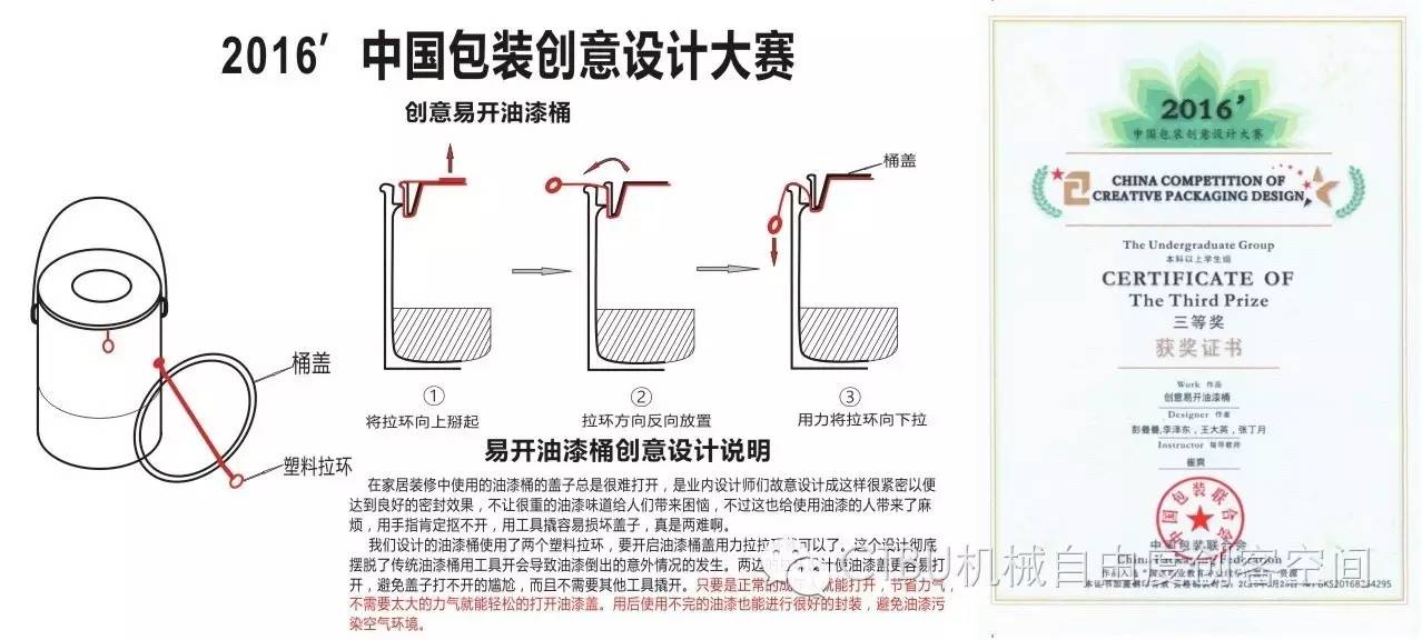 2013级包装班彭曼曼团队,创新设计的“创意易开油漆桶”包装,解决了油漆桶使用中的开启困难的问题,工人在油漆操作中开启和保存油漆变得更容易和方便。获2016中国包装创新设计大赛三等奖。