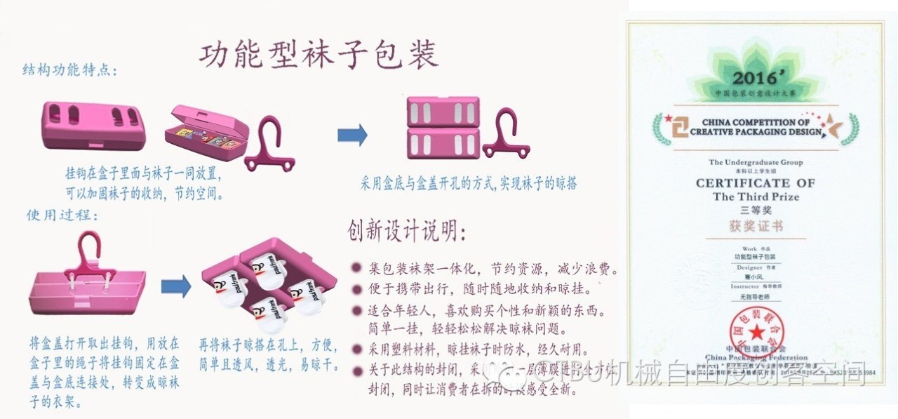 2013级包装班蹇小风创客团队,在徐绍虎老师的指导下,创新设计出“功能型袜子包装”,获全国三等奖。