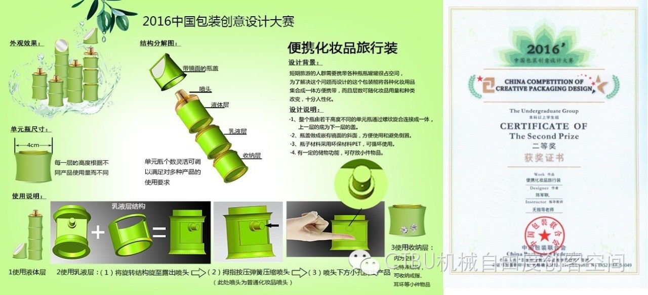 2013级包装班陈军联、马丽艳创客团队,在导师张书彬的指导下,创新包装设计作品“便携化妆品旅行装”获得全国包装创新设计二等奖。