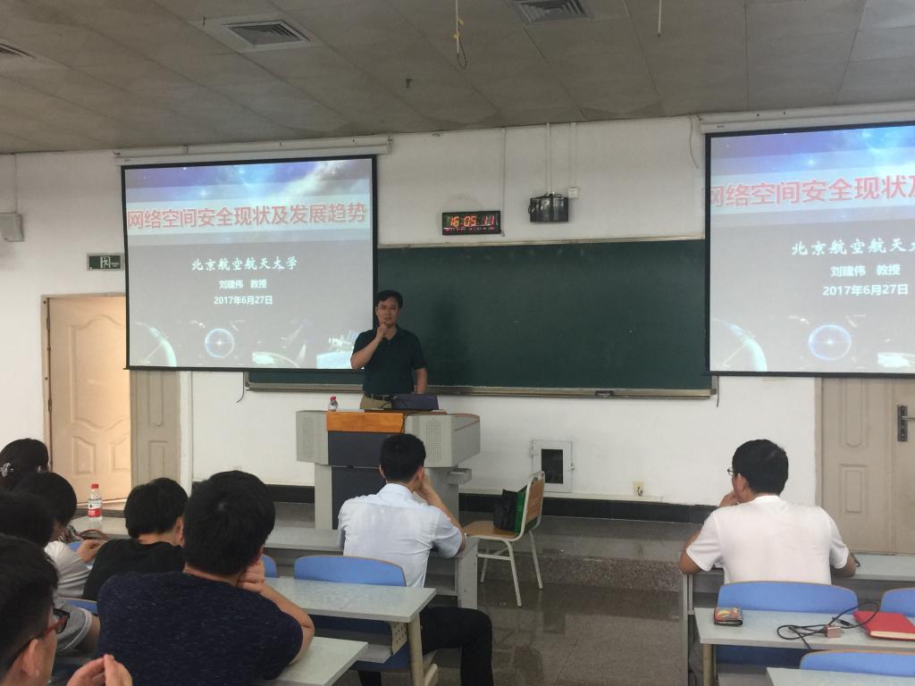 6月27日下午,北京航空航天大学博士生导师刘建伟教授应邀到公司进行学术交流,并在慧智楼90208教室,为伟德国际1949和计算机科学与信息工程公司的员工们做了题为“网络空间安全现状及发展趋势”的学术讲座。伟德国际1949杜力经理、李平副经理、计信公司杨光祥副经理、部分老师和两个公司的同学们参加了此次讲座。