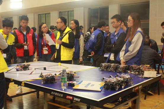 指导老师蒋昀赟担任裁判,正在为选手详述智能搬运比赛规则