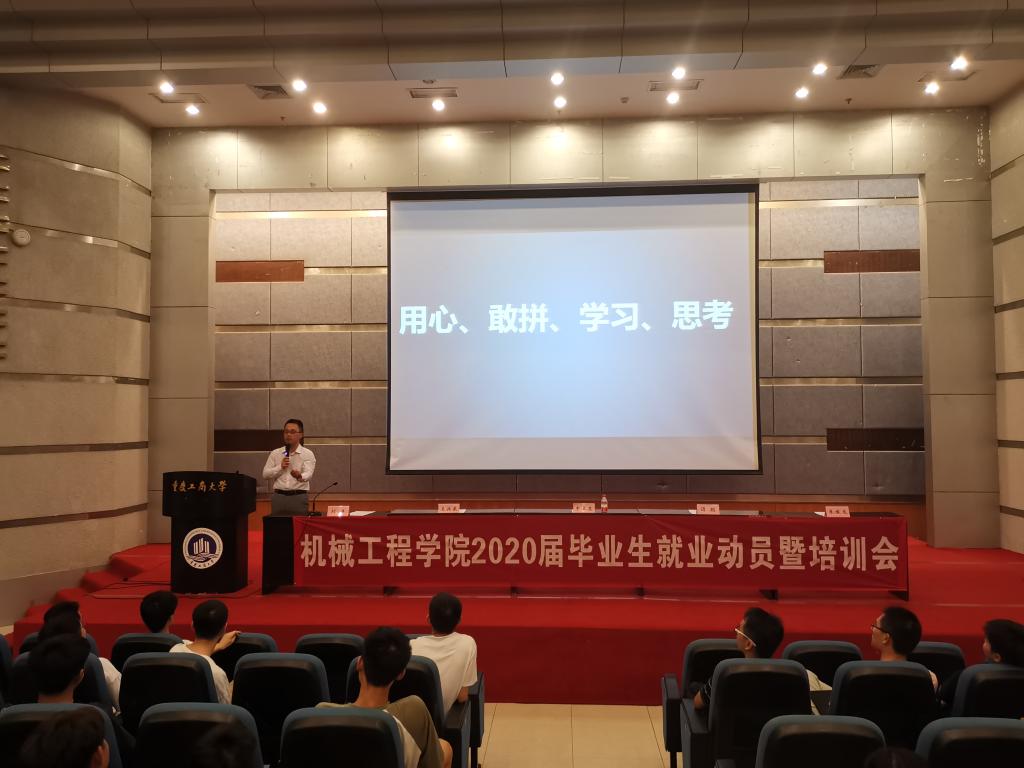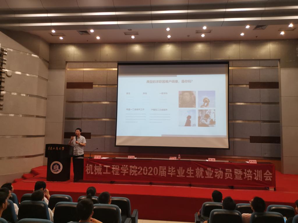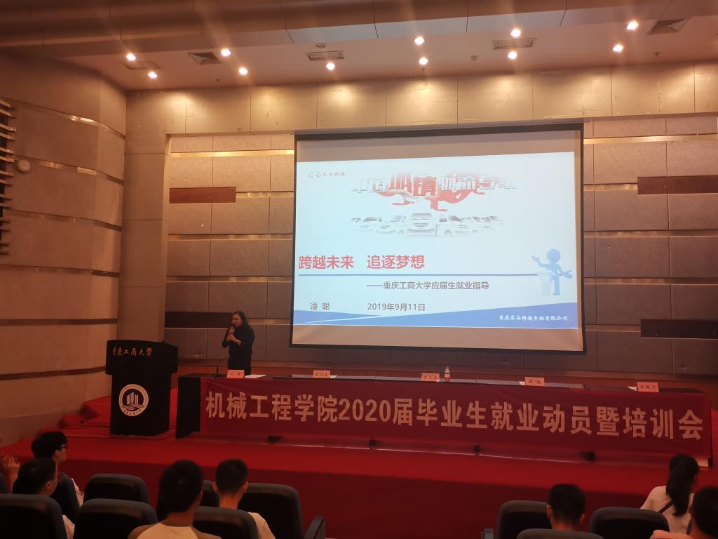 为助力2020届毕业生顺利开启职业生涯,早日实现就业、创业,9月11日晚上6点半,伟德国际1949在7100学术报告厅召开了2020届毕业生就业动员暨培训会。人才招聘处处长申卫东,华晨鑫源重庆汽车有限公司人力资源部部长王兴东,重庆长安跨越集团有限公司招聘配置室主任谭聪,重庆聪筑信息科技有限公司、重庆悟修企业管理咨询有限公司创始人、总经理朱峻龙,毕业班辅导员和公司2020届毕业生参加了本次培训大会。会议由公司党总支书记刘洋主持。