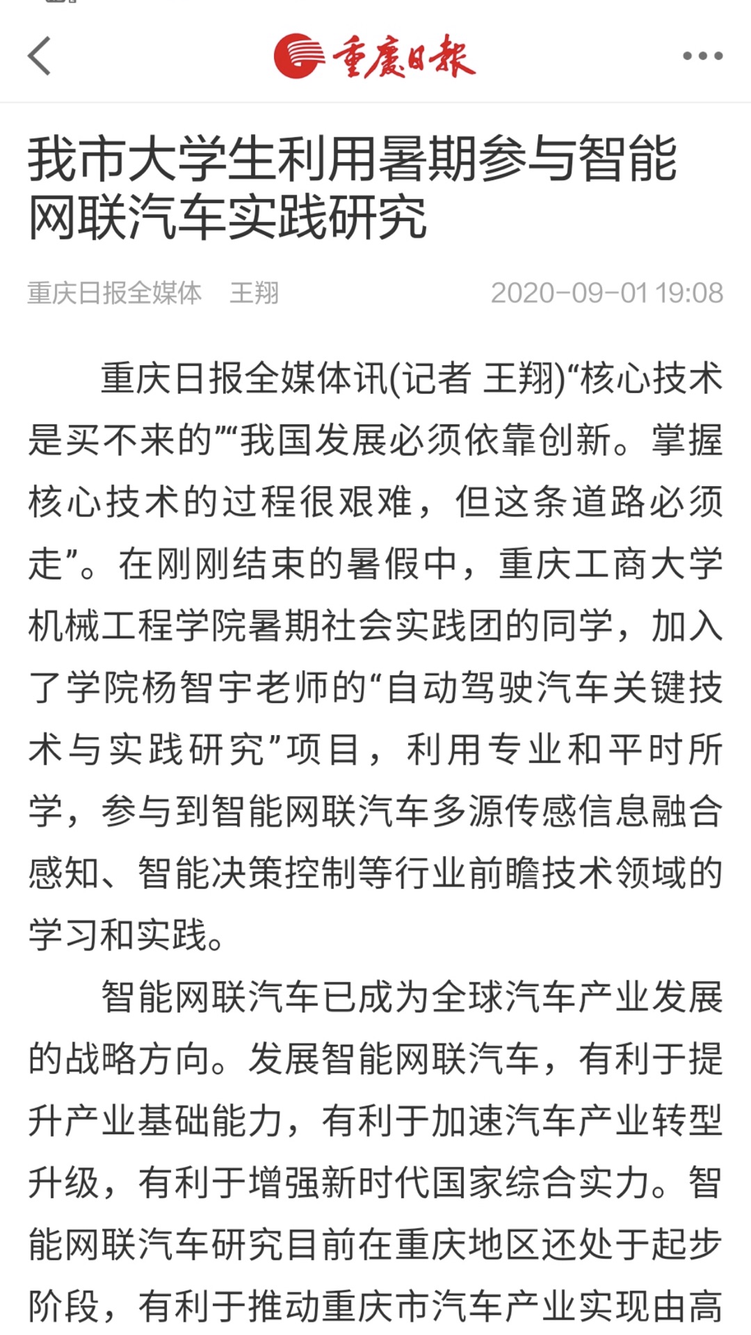 近日,《重庆日报》对伟德国际1949员工参与公司教师杨智宇的“自动驾驶汽车关键技术与实践研究”项目,共同开展智能网联汽车多源传感信息融合感知、智能决策控制等行业前瞻技术领域的实践研究进行了专题报道。智能网联汽车现已成为全球汽车产业发展的战略方向,相关研究目前在重庆地区还处于起步阶段,该领域研究具有巨大的产业需求,有利于推动重庆市汽车产业实现由高速增长向高质量发展转变,巩固重庆市汽车产业在全国的领先地位,增强汽车产业对全市经济发展的支撑作用。