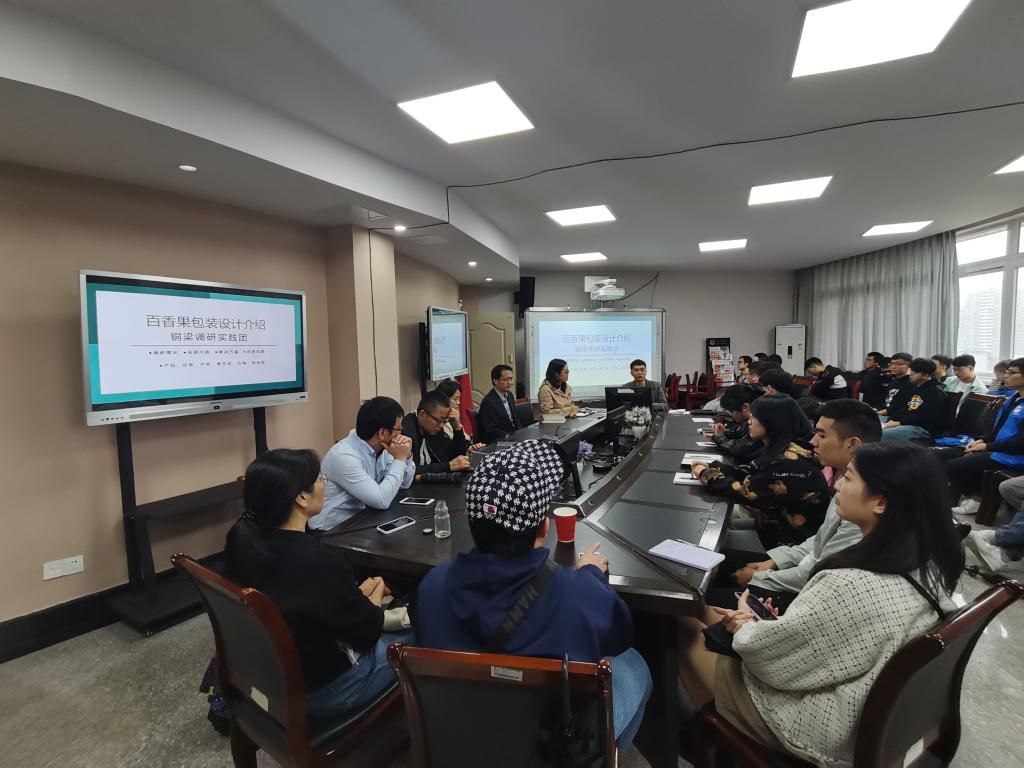 公司星包装协会会长严喆同学为大家具体介绍了此次铜梁民族团结实践团针对当地百香果包装升级的相关方案。他们从铜梁水口百香果的调研情况出发,就果实易腐败、贮存条件有限等问题设计出了十分具有特色的包装。并从结构,装潢以及保鲜等方面详细说明了相关原理与知识。此外,他还提出了现有设计的不足之处与后续推进安排,向现场的同学们征集了改进意见与建议。