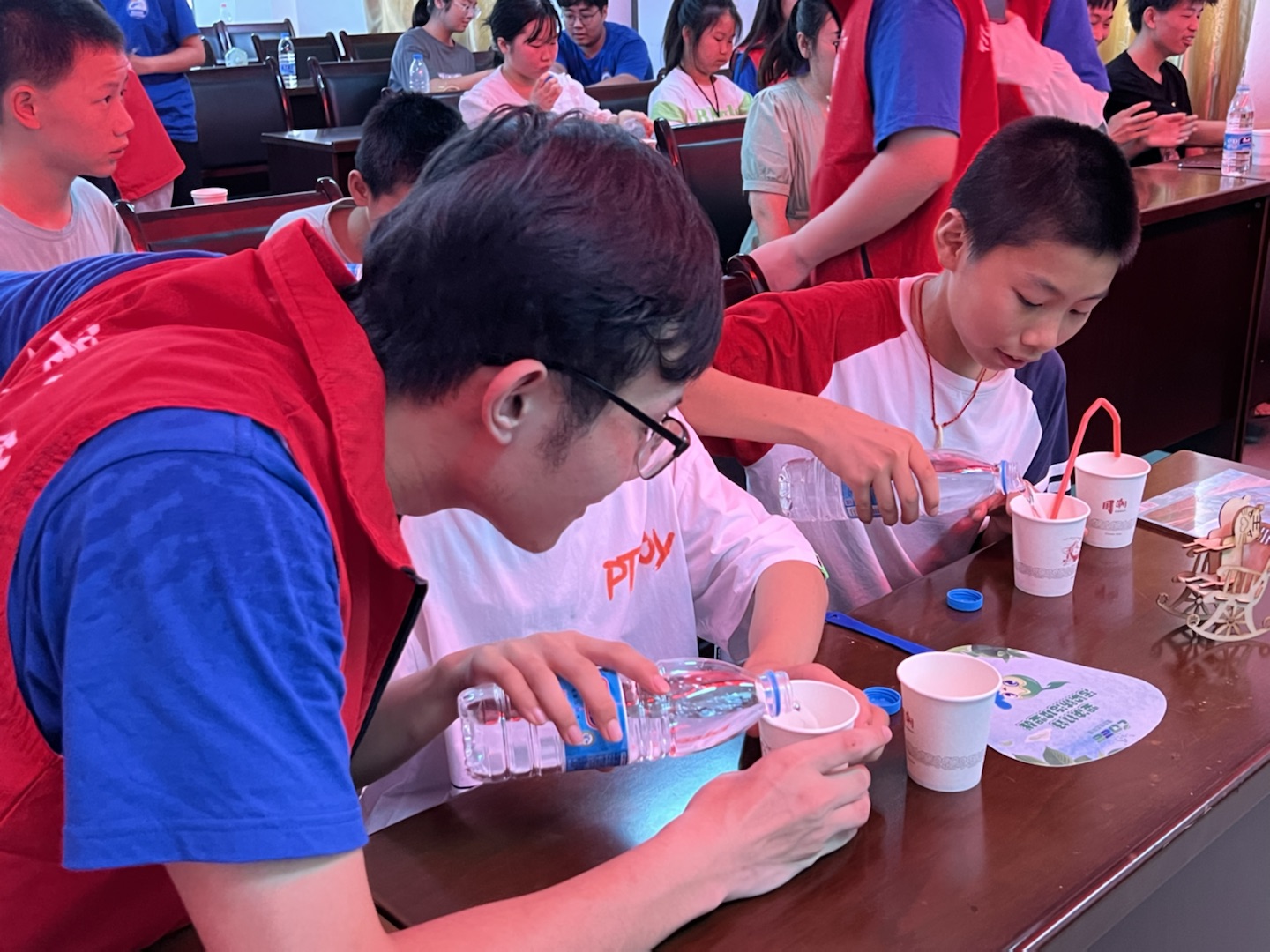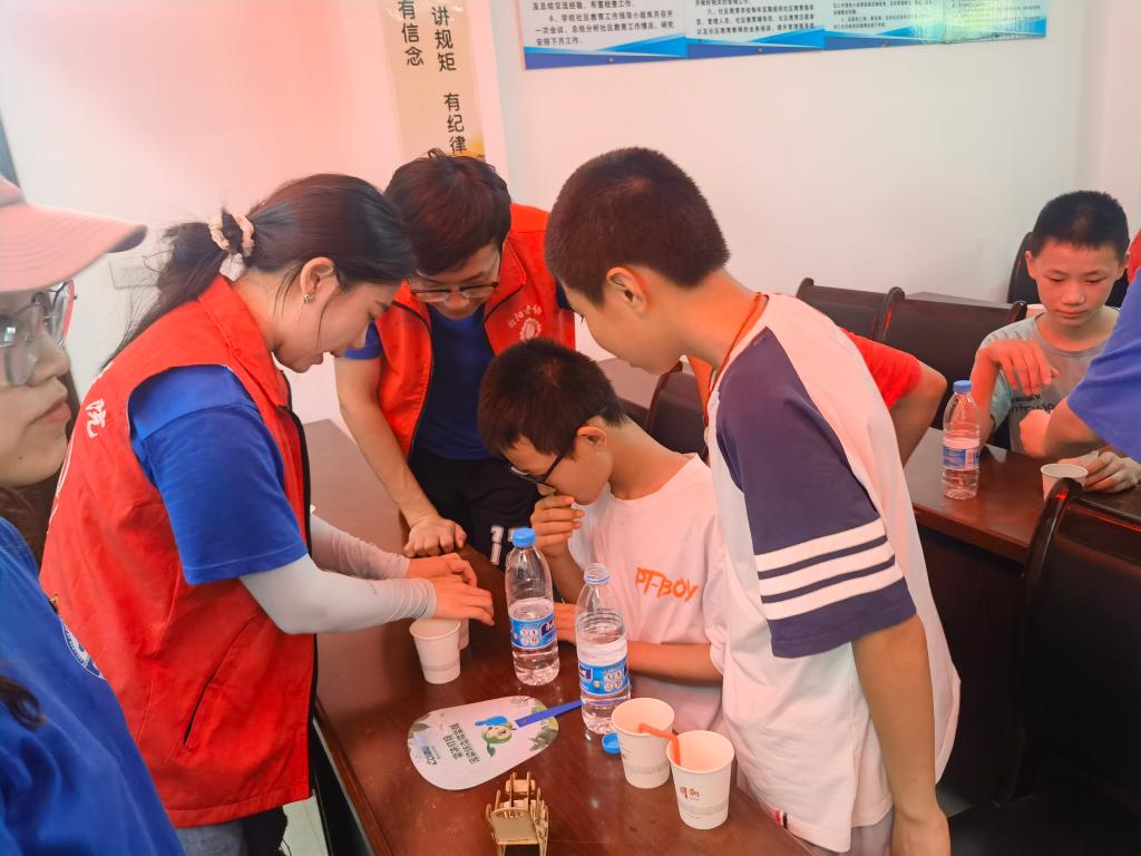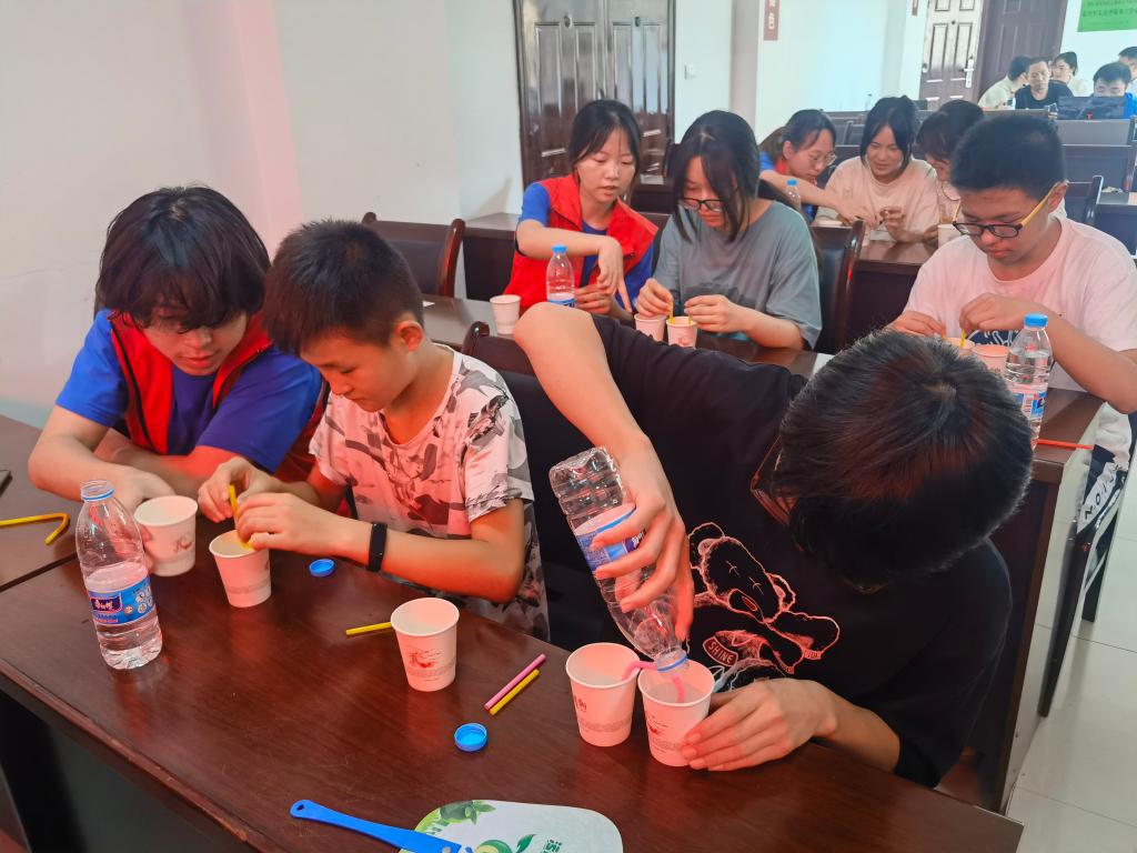 实践团成员们还带领员工们开展了科普小实验——“蓝海沉浮”和“流动的水”。让同学们直观地看到科学的奥秘,学到酸碱中和产生气体的化学知识和U形管“虹吸现象”的物理知识,加深了他们的理解。