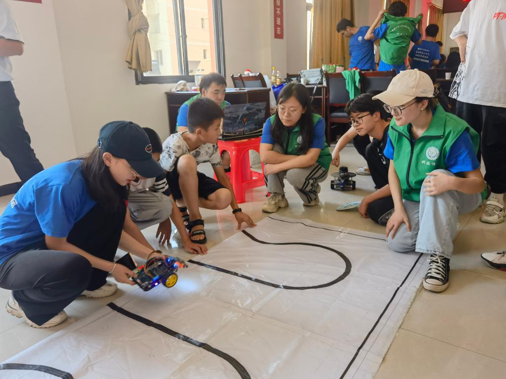 蒲俊霖同学为孩子们介绍了ROS智能小车。他从作品介绍、基本概念、实机演示三个方面深入浅出地描述了小车的特点与构造,并通过列举冰箱、人体器官等生动有趣的例子让同学们理解了很多冗杂晦涩的机器人专业术语,大家听得津津有味,无一不跟随着“蒲老师”的讲述进行着思考与讨论。“蒲老师”还带来了教学模型,给他们现场演示了智能小车的行驶功能、建图功能和导航功能。看着小车在平地上飞速奔驰,同学们的心也随之一起插上梦想的双翼,飞向了蔚蓝天空。