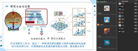会上,6位2021级研究生就各自的研究内容进行了汇报。梁鑫鑫同学介绍了高压电场的油液多级梯度过滤装置及其特性,该过滤装置在当前油液分离实践中得到广泛应用,在分离液中施加一定频率的电场以及进行恒温控制会提高杂质的分离效率;黄凌波同学对耦合矩阵电极和聚结球增强乳液脱水的实验过程进行了详细介绍,该实验提出了将一种聚结颗粒与矩阵电极结构电场相结合的处理办法,这种方法可以增强油包水乳液的破乳脱水能力,大大提高了脱水效率;张浩华同学介绍了一种工业废油多梯度过滤系统协同热-电耦合强化异构旋流体真空分离装置,这种装置的实验环境要求是真空,其主要特点在于多梯度过滤装置与热-电施加装置协同作用,加载混沌脉冲电场后,对静/动态废油都有良好的提纯效果;方原同学简要地介绍了电场在废油处理中的应用,通过常规的物理方法与混合方法进行电场叠加,再作对比分析,得出结论无论是单一的分离方法还是多种方法协同并用,在施加电场的情况下,废油分离效果都会有明显的提升;陈曦同学介绍了基于咖啡环效应的颗粒检测实验研究方法,探寻了沉积图案与粒径、蛋白质种类之间的关系,同时介绍了液滴蒸发研究现状及意义,极大地丰富了我们对液滴蒸发图案的认识;陶山佳同学介绍了磁性液滴自组装的背景及优势,以及磁性液滴的基本原理和诱导控制的基本条件。
